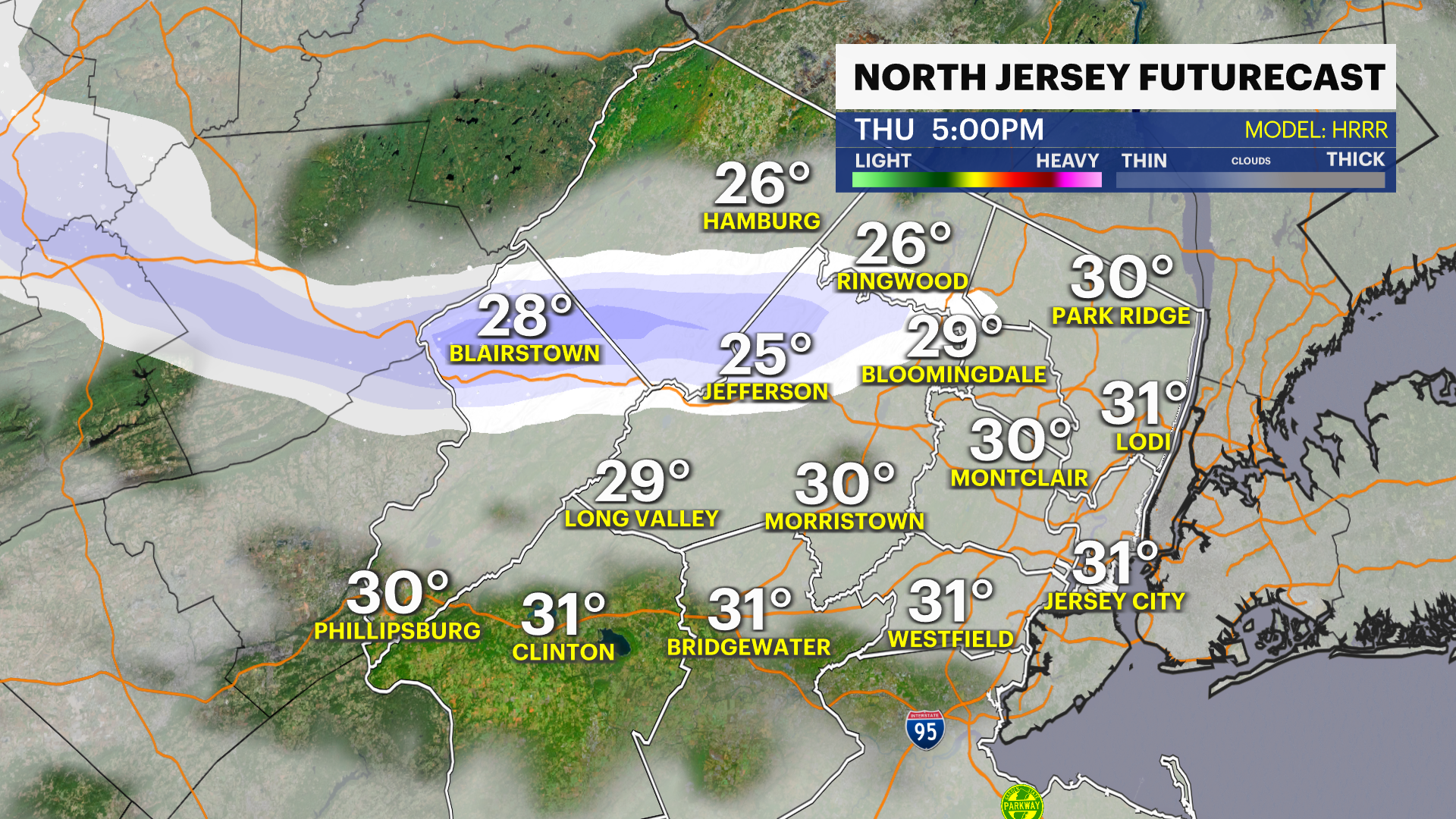 A batch of windswept flurries blows across northern New Jersey this evening from 5 p.m. to 8 p.m. A light dusting/trace of snow is possible in select spots. Not a big deal, though!