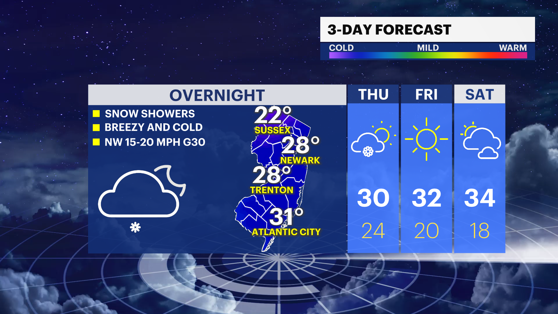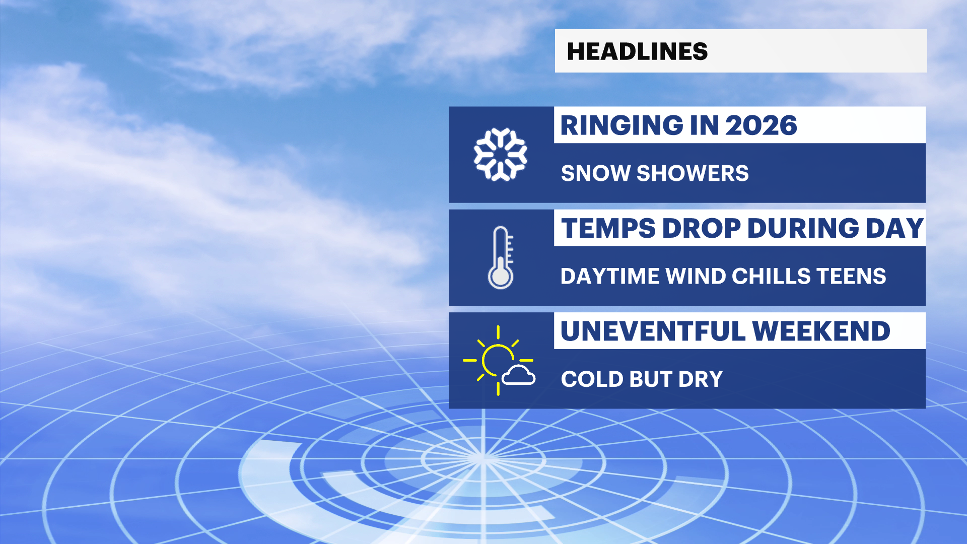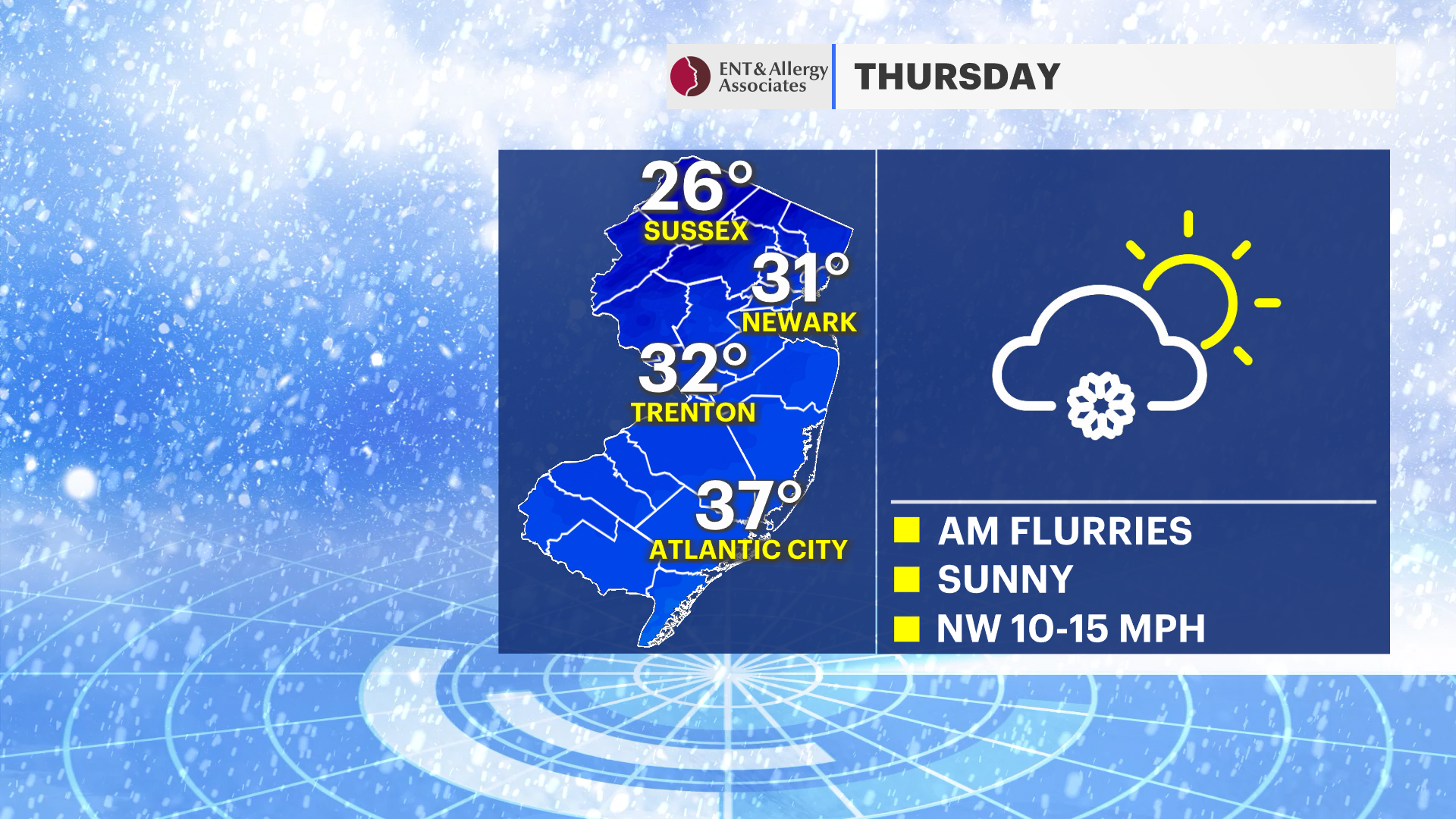 THURSDAY: Morning flurries. No accumulation. Cold and sunny. High of 31.