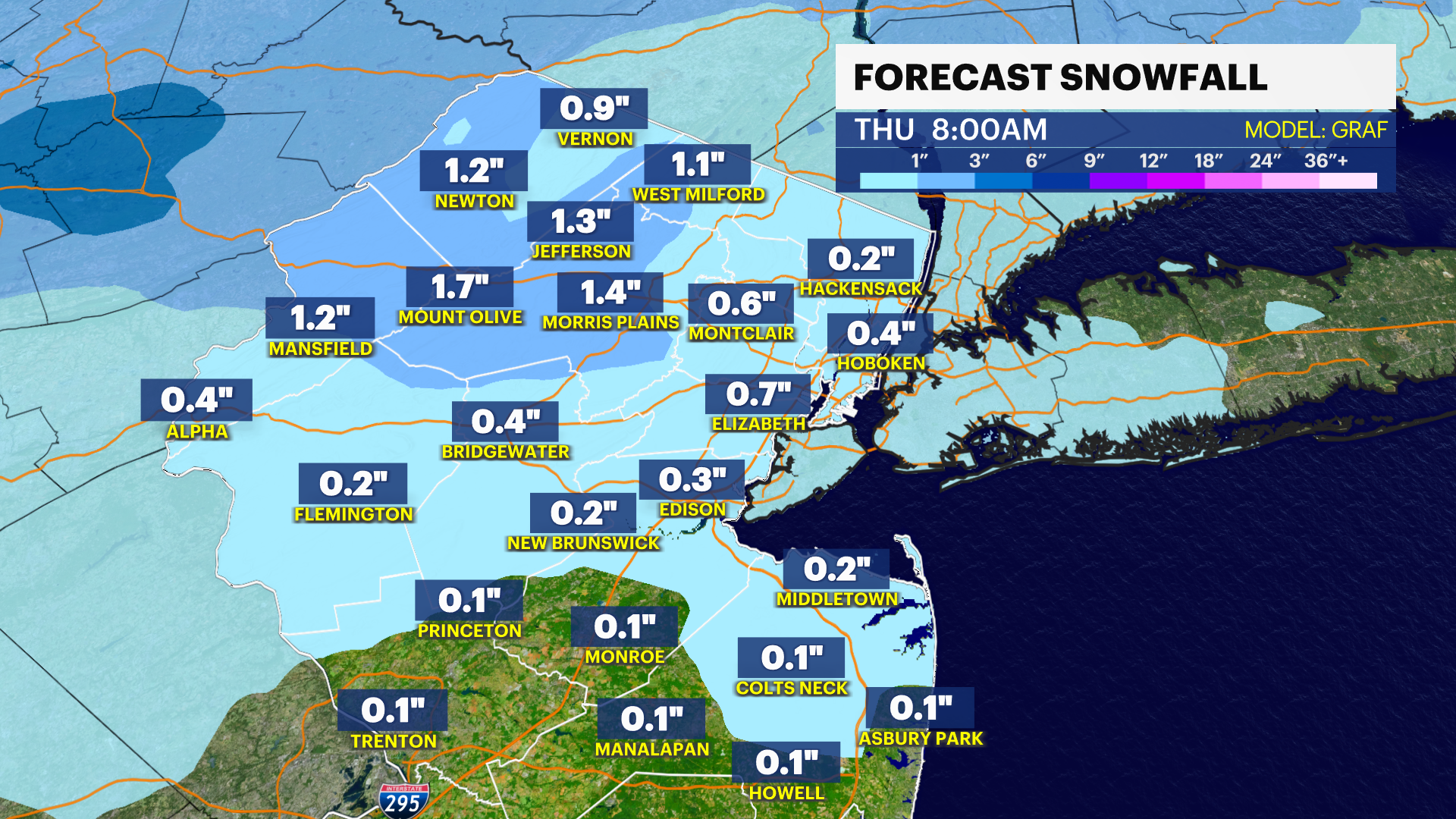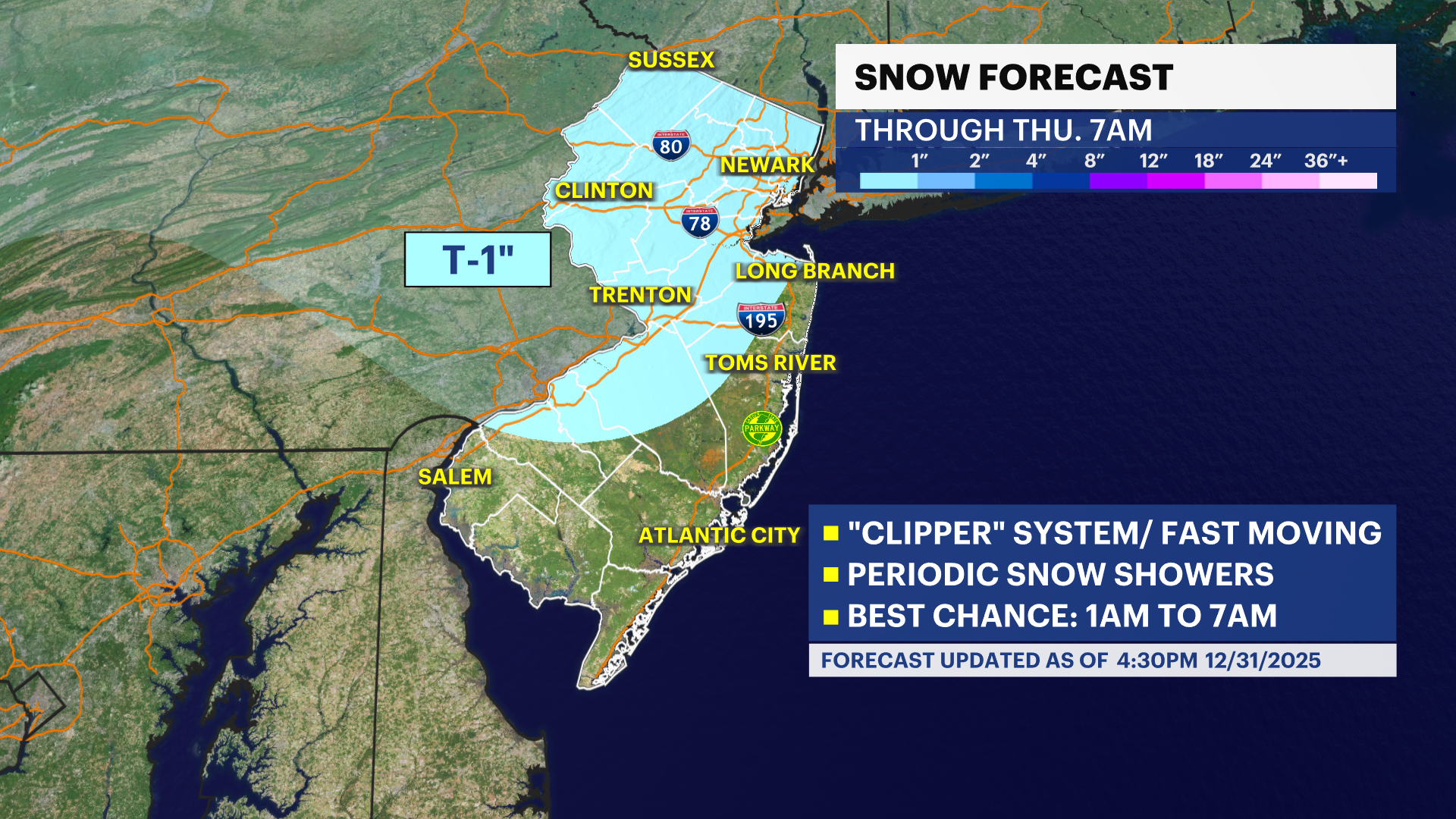 Expect some light, scattered snow showers approaching midnight in the tri-state area.