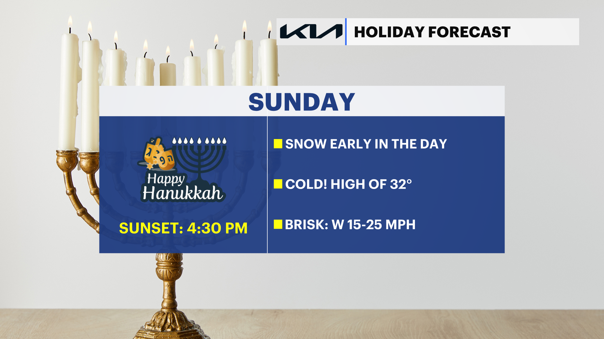 Snow does arrive overnight into Sunday morning, dropping 1 to 3 inches across the state for Sunday morning. The light snow leaves for slippery impacts early on Sunday, but it wraps up by noon to a sunny afternoon sky. It remains cold and roads improve quickly. This light dusting of snow comes just ahead of the Hanukkah holiday.