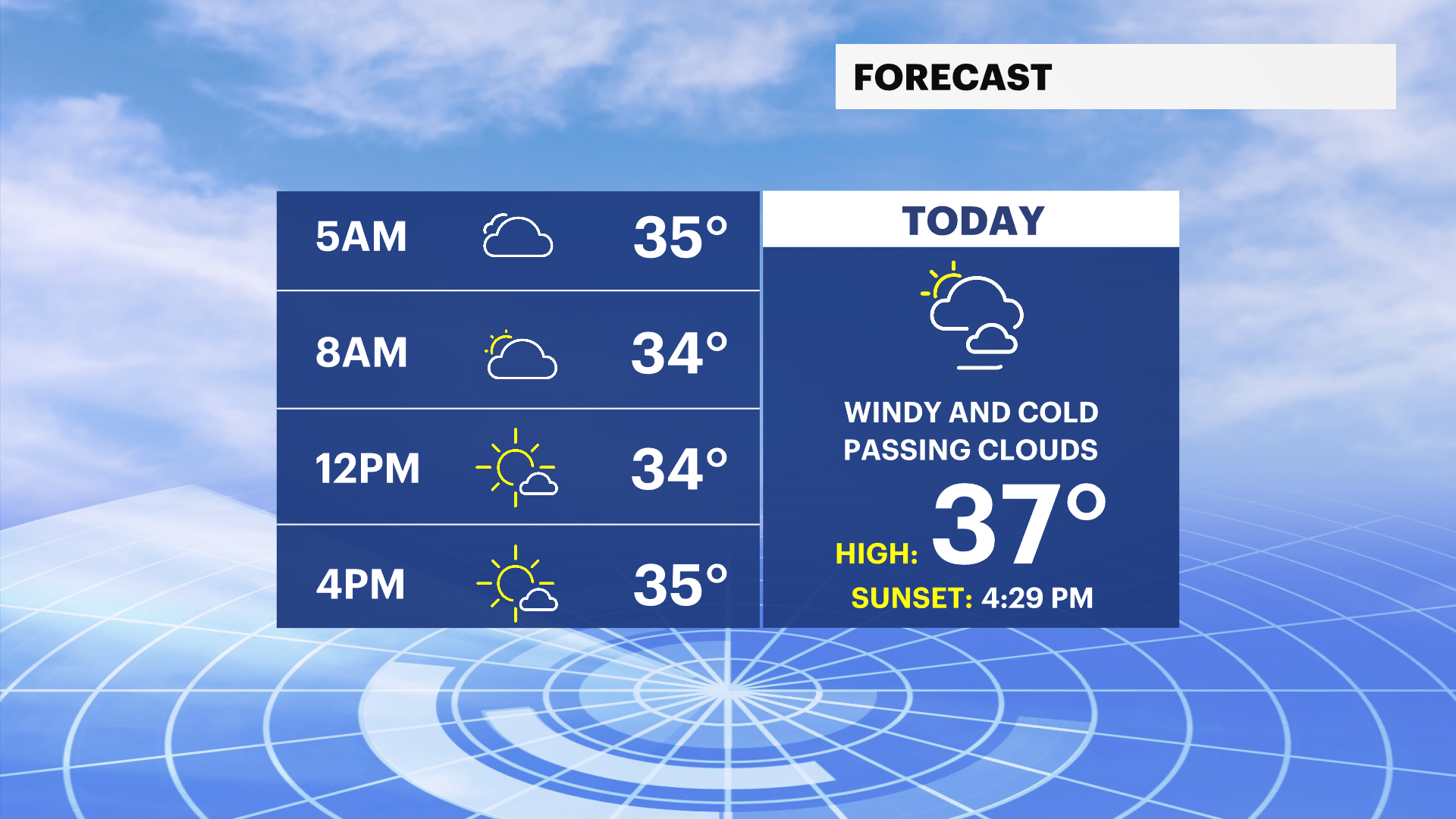 Tomorrow will be sunnier and still cold with highs in the mid-30s with lightly breezy conditions.