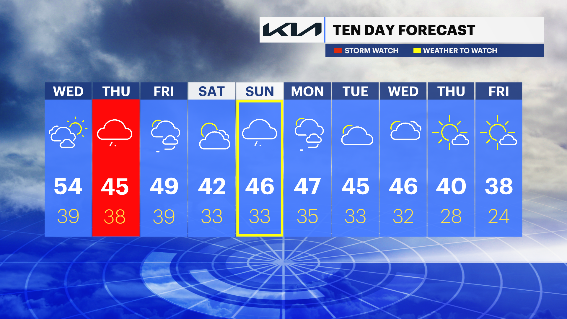 WEEKEND: Saturday is the better day of the weekend, with a mix of sun and clouds and daytime highs around 42. Sunday will see mostly cloudy skies with the possibility of some rain. Daytime highs will be around 46.