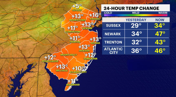 The track of this system is well to our north and west, which places New Jersey on the milder side of things. There is a little bit of snow falling through Sussex County, but most of the precipitation that we see will be in the form of rain. Worst case scenario with snow would be an inch in the highest elevations.