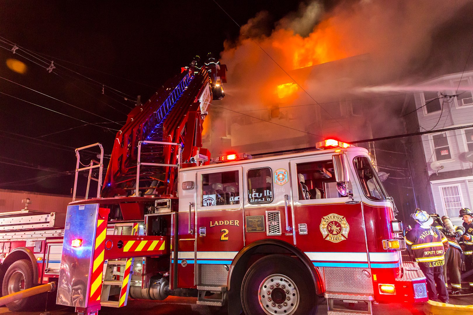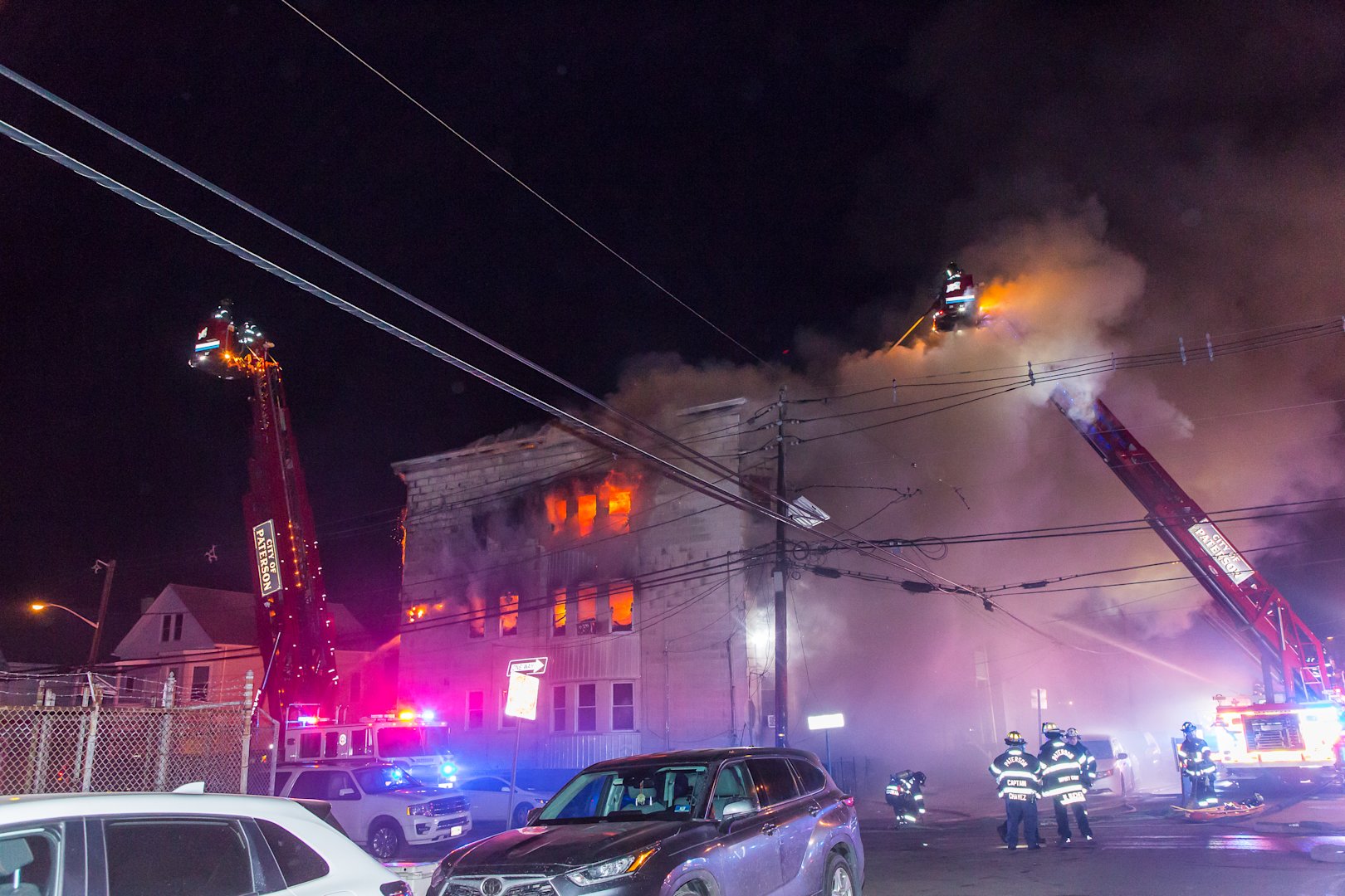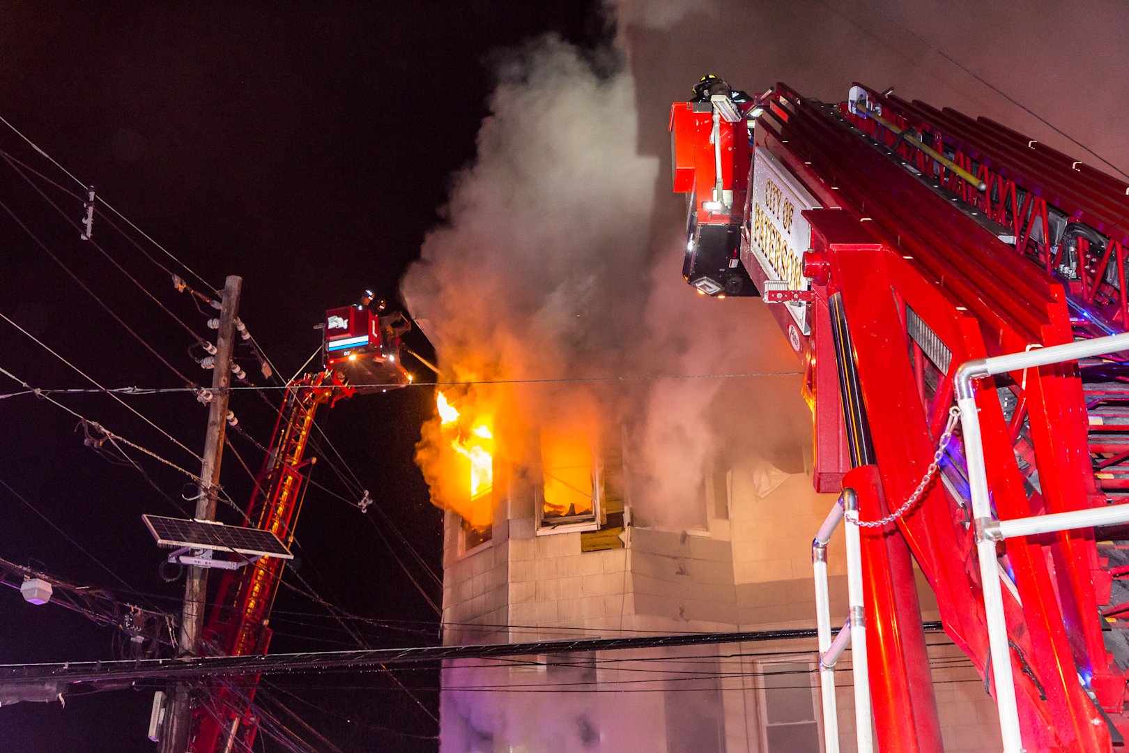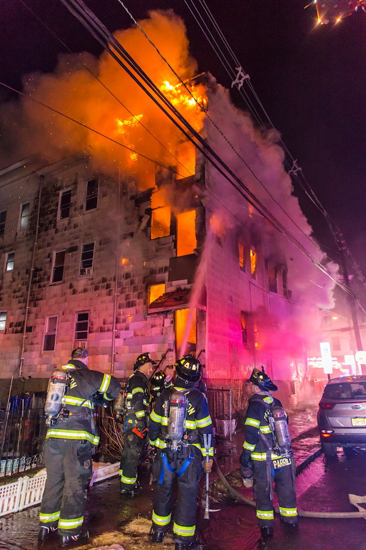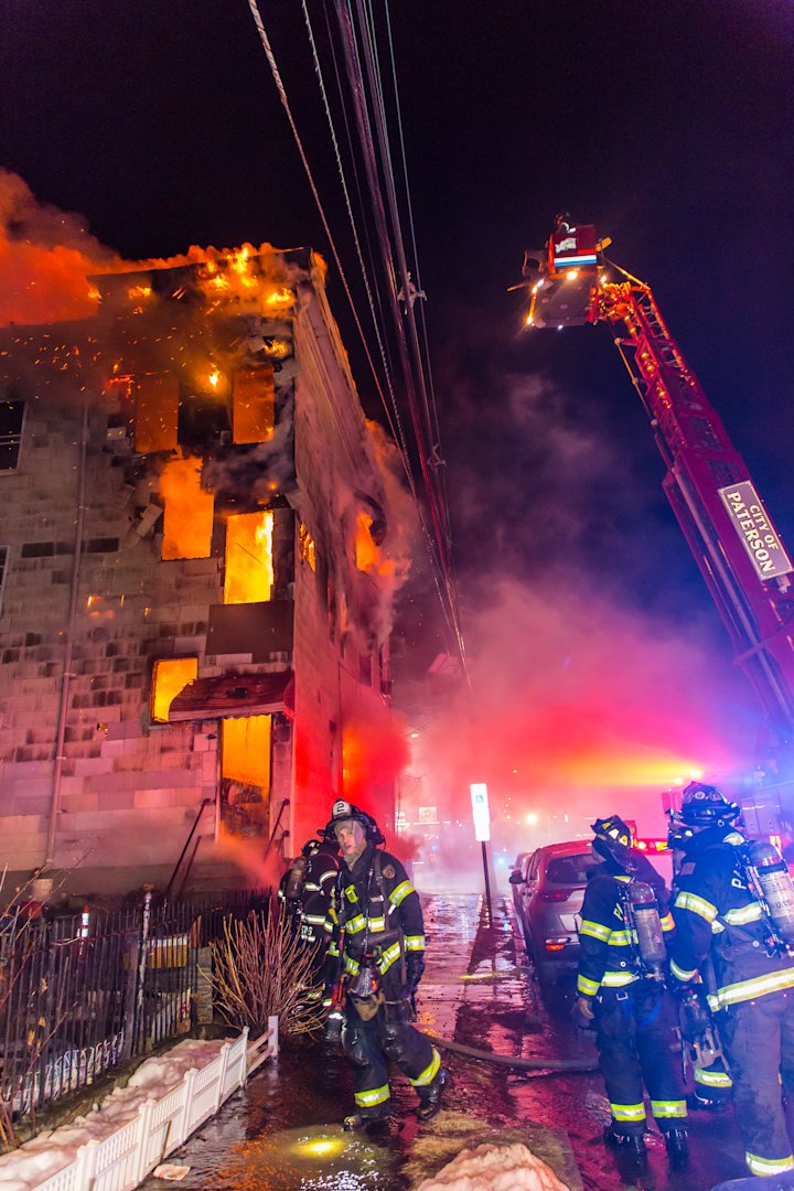 Falling debris struck a Paterson firefighter during the response. The firefighter was taken to St. Joseph's Medical Center for treatment of a concussion and has since been released, according to fire officials.