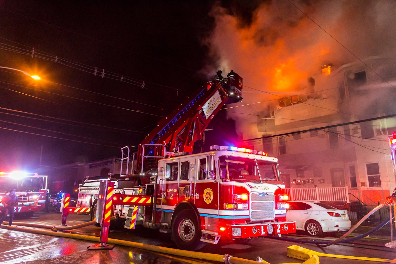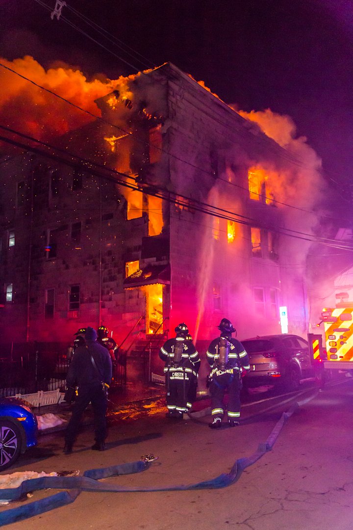The fire erupted on the second floor of a three‑story apartment building at the corner of Getty Avenue and Thomas Street. The blaze escalated to a third alarm as crews worked to contain heavy flames that spread through six apartments.