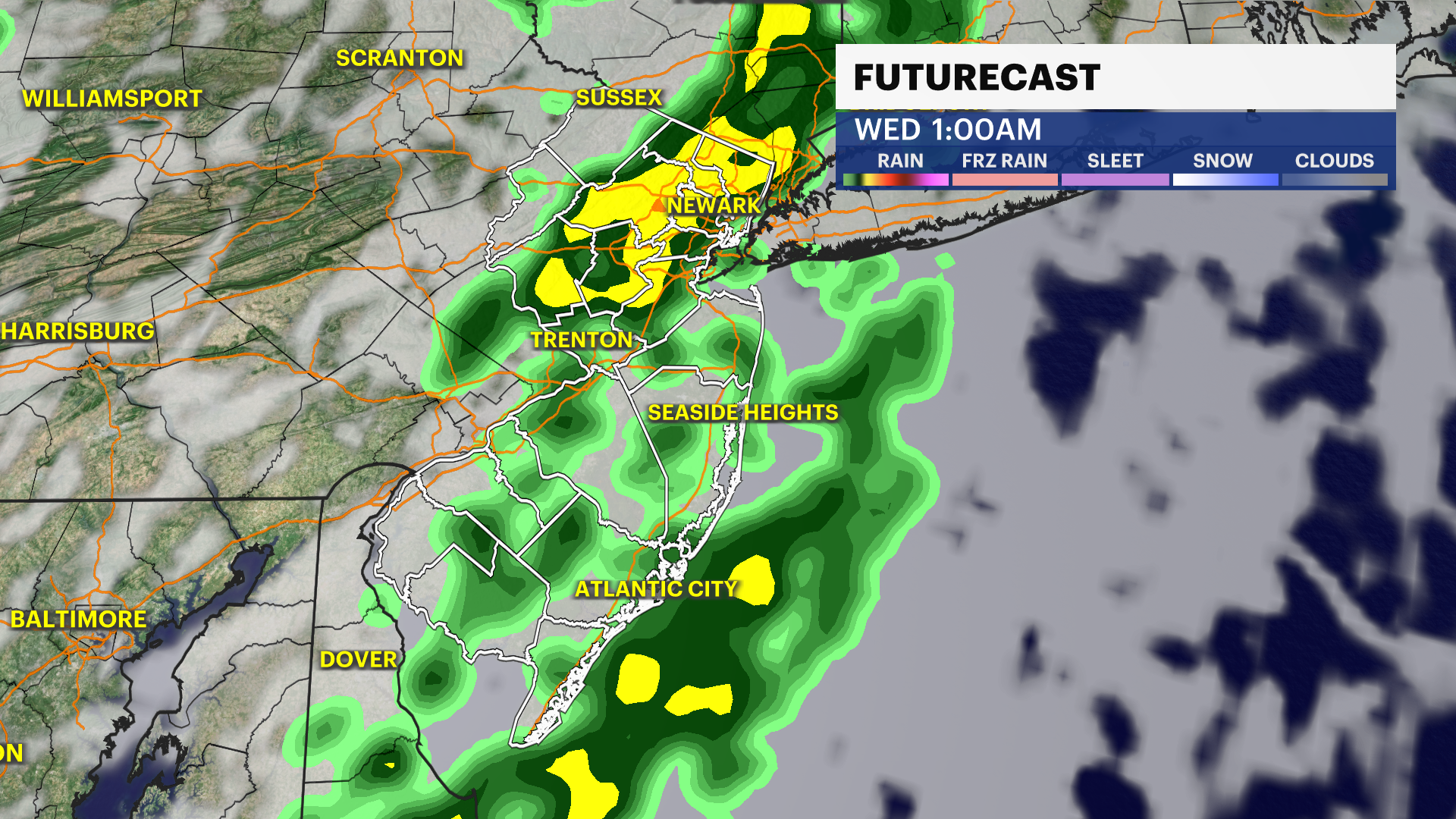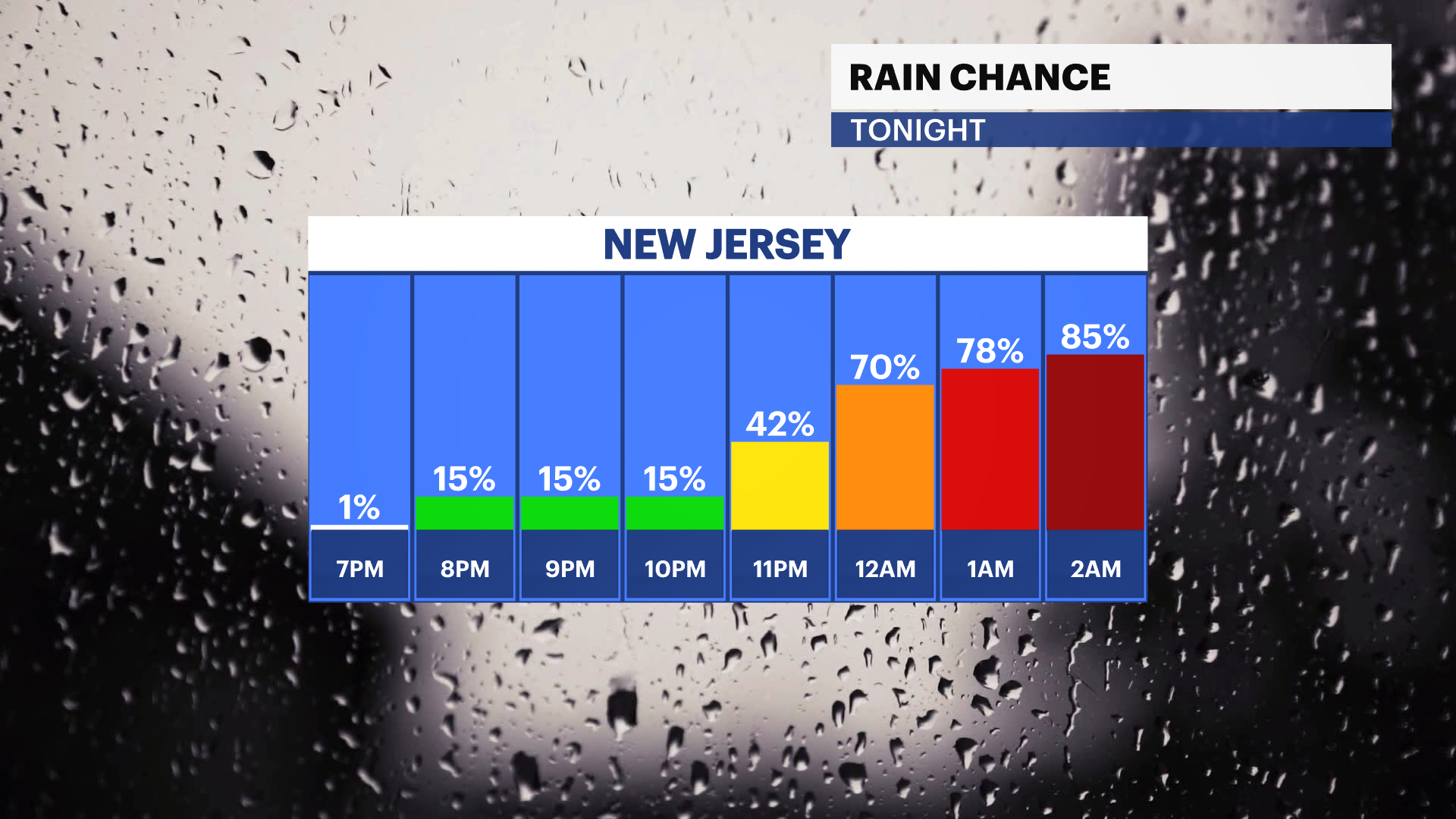 A batch of overnight rain crosses New Jersey between 10 p.m. and 5 a.m.