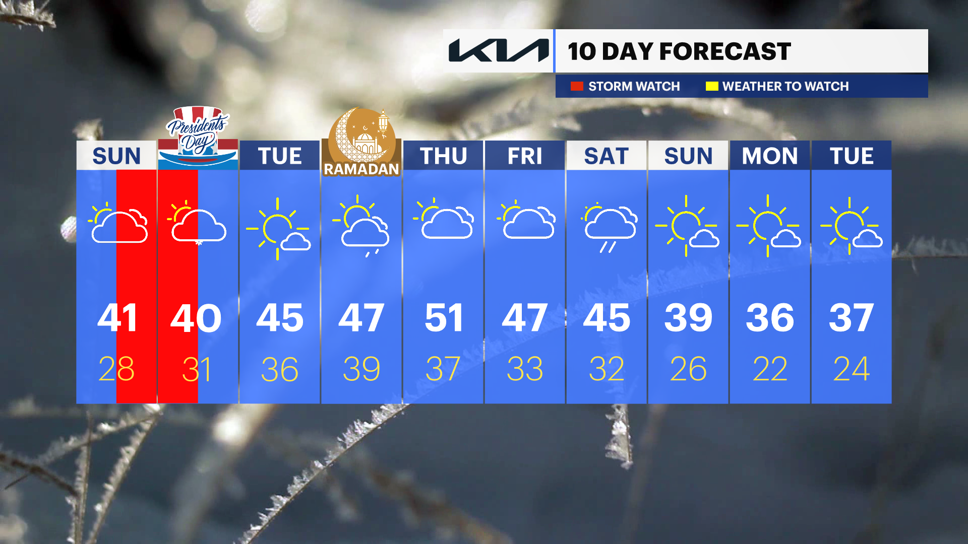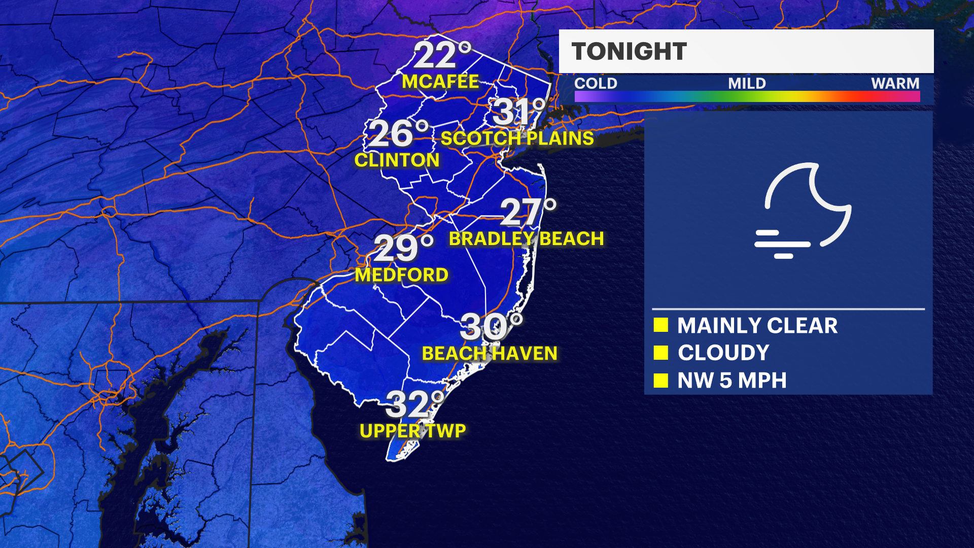 Monday will begin cloudy but should become partly sunny by midday, with temperatures near seasonal levels. Tuesday remains mild as highs return to the 40s.
