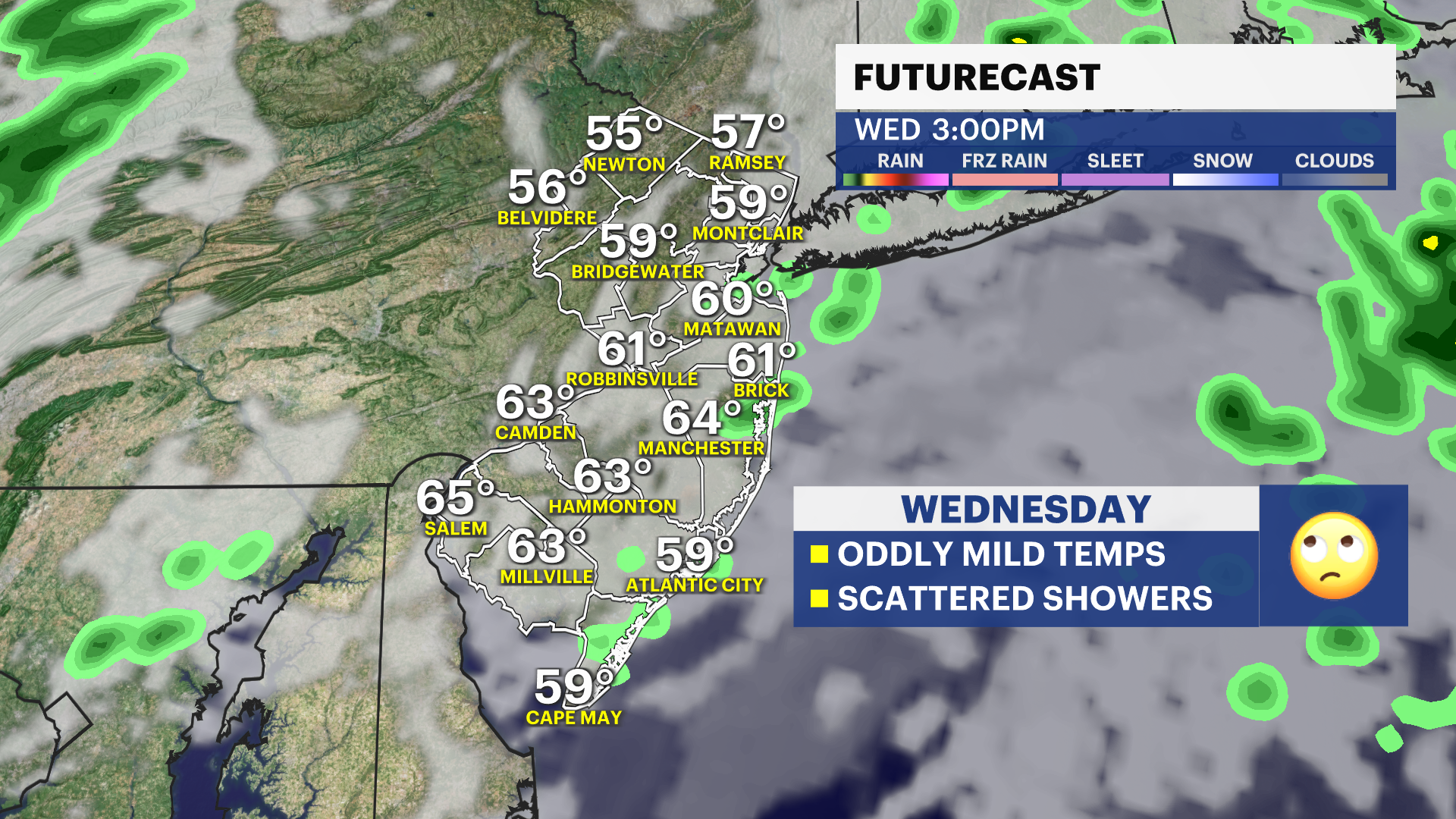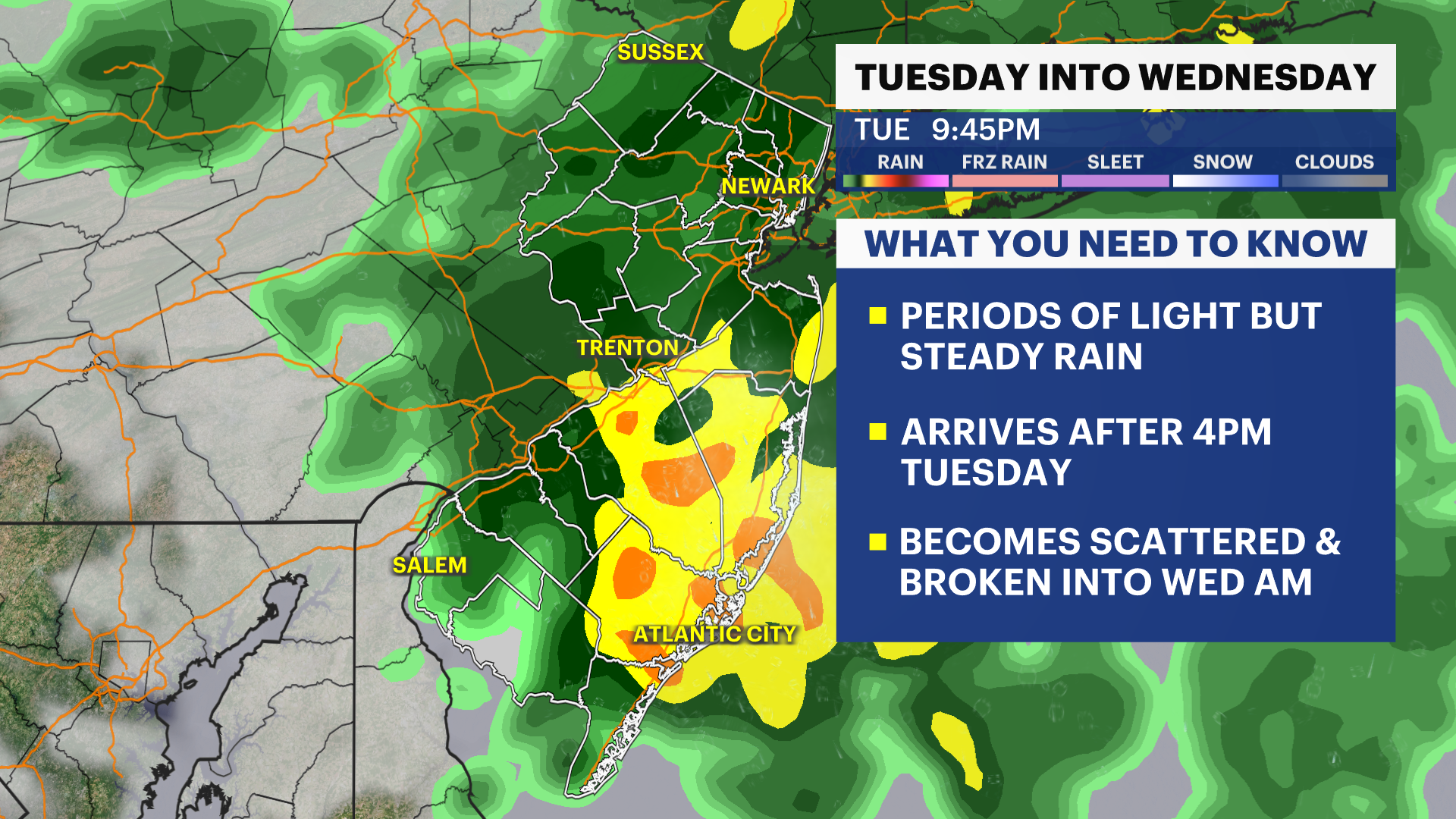 Rain showers arrive to New Jersey after 4 p.m. Tuesday with rain breaking up overnight to scattered showers into Wednesday morning.