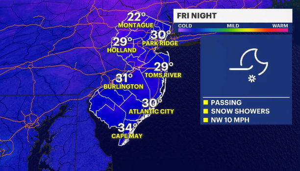 Friday night has a possible interesting feature swinging through in the overnight hours (after midnight). There is a fast-moving disturbance that will usher in some passing snow showers. Will it collect? No, not really. The majority of the flakes fall when we are asleep, but waking up on Saturday morning, it's possible there might be a general coating in northern New Jersey.