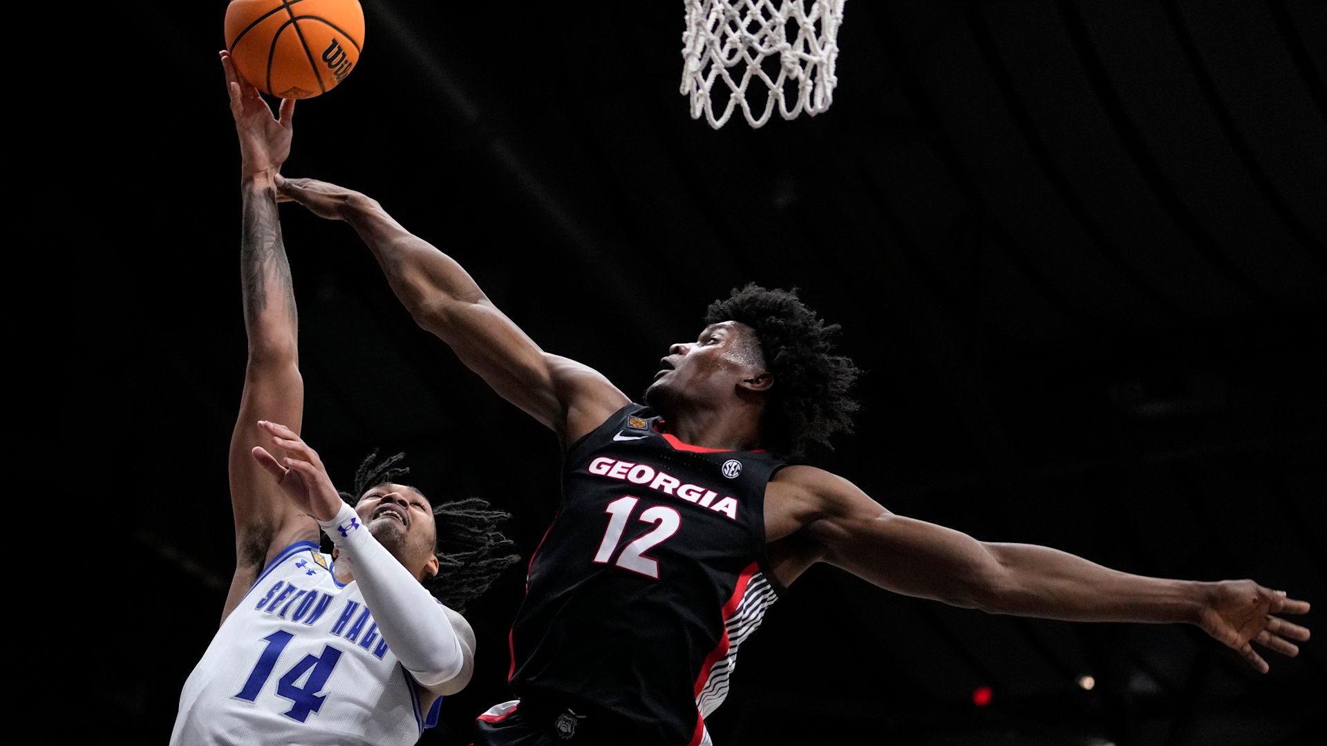 Seton Hall guard Dre Davis (14) shoots over Georgia forward Matthew-Alexander Moncrieffe (12) in the second half of an NCAA college basketball game in the semifinals of the NIT, Tuesday, April 2, 2024, in Indianapolis. Seton Hall won 84-67. (AP Photo/Michael Conroy)