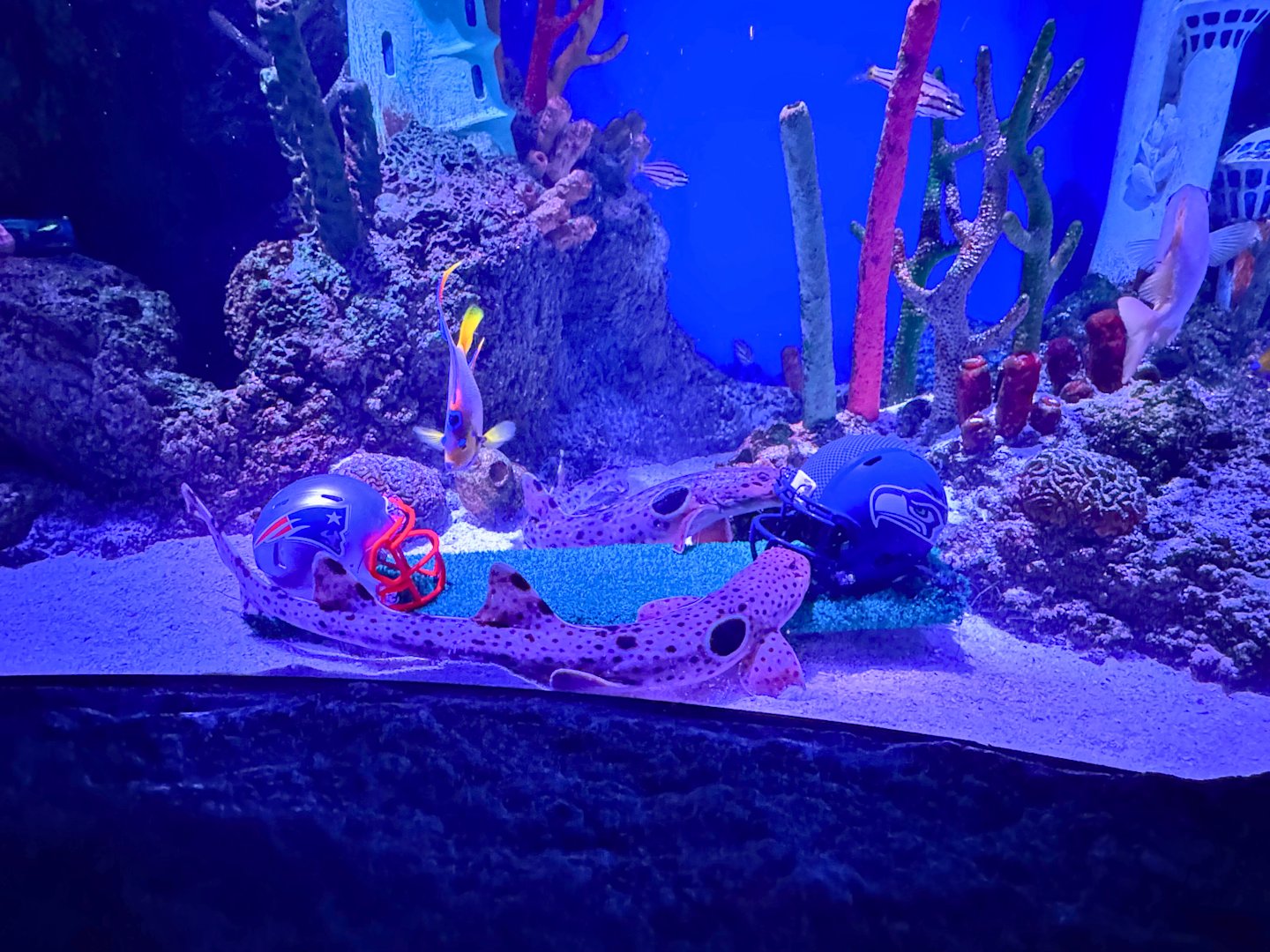 The sharks were presented with football helmets placed inside the Coral Reef exhibit ahead of Sunday. One shark swam directly to the Seahawks, while the other passed the Patriots and also chose the Seahawks, aquarium officials said.