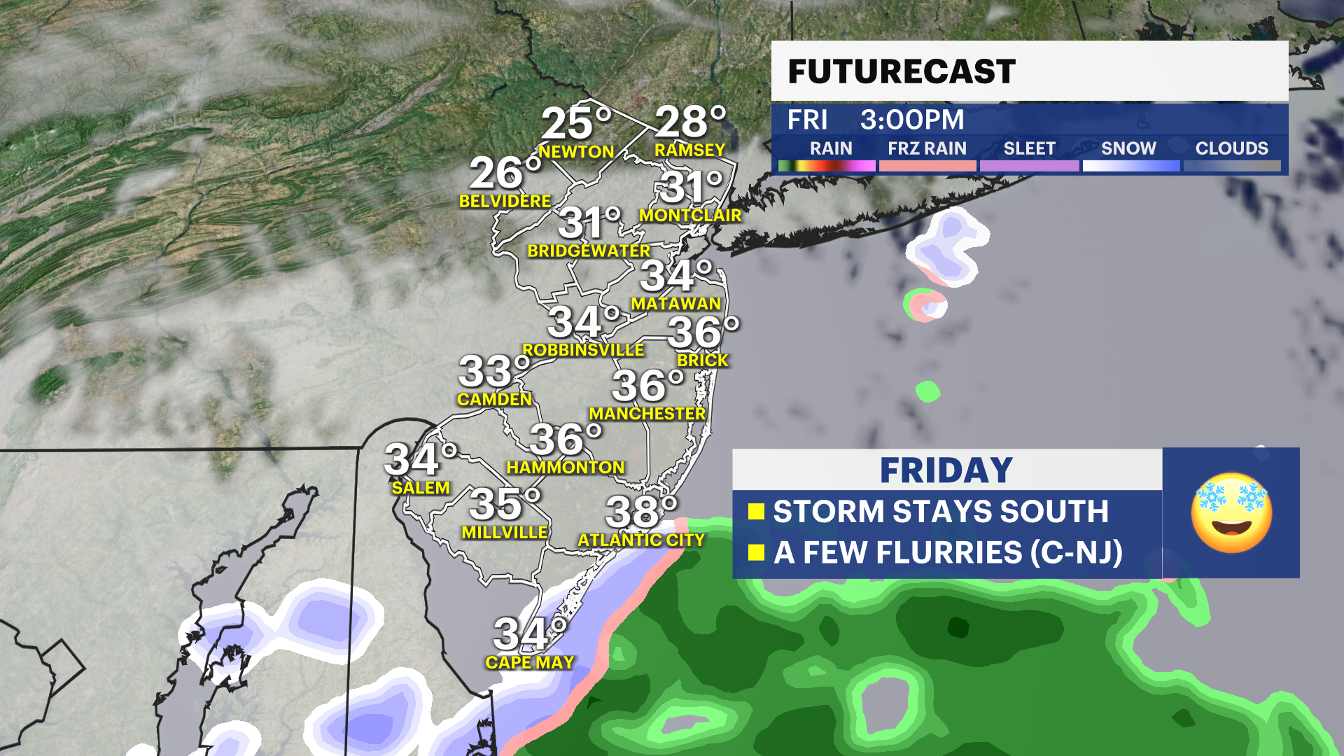 Cold air continues for the midday with a storm to the south that delivers only flurries for south and central NJ.
