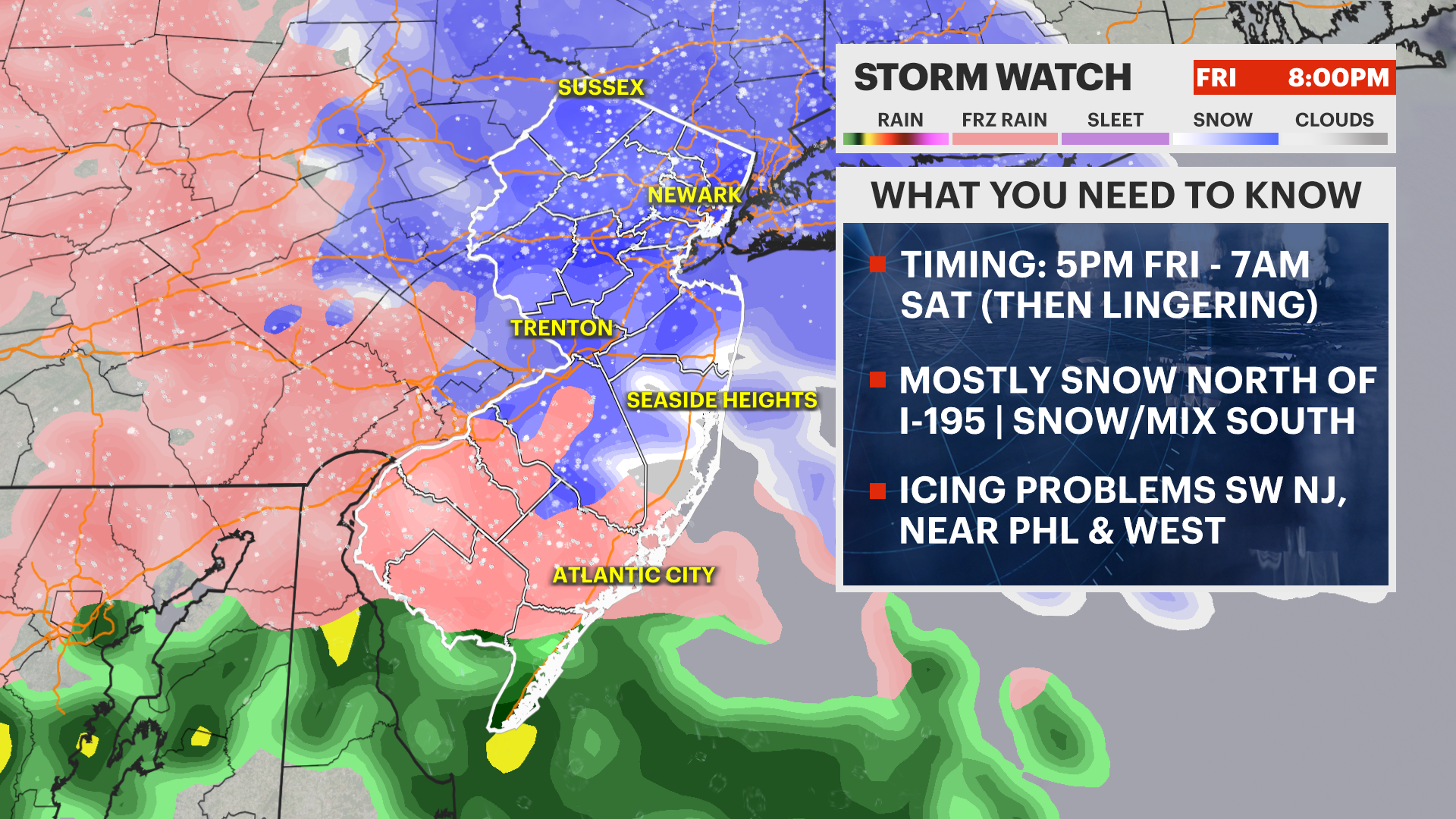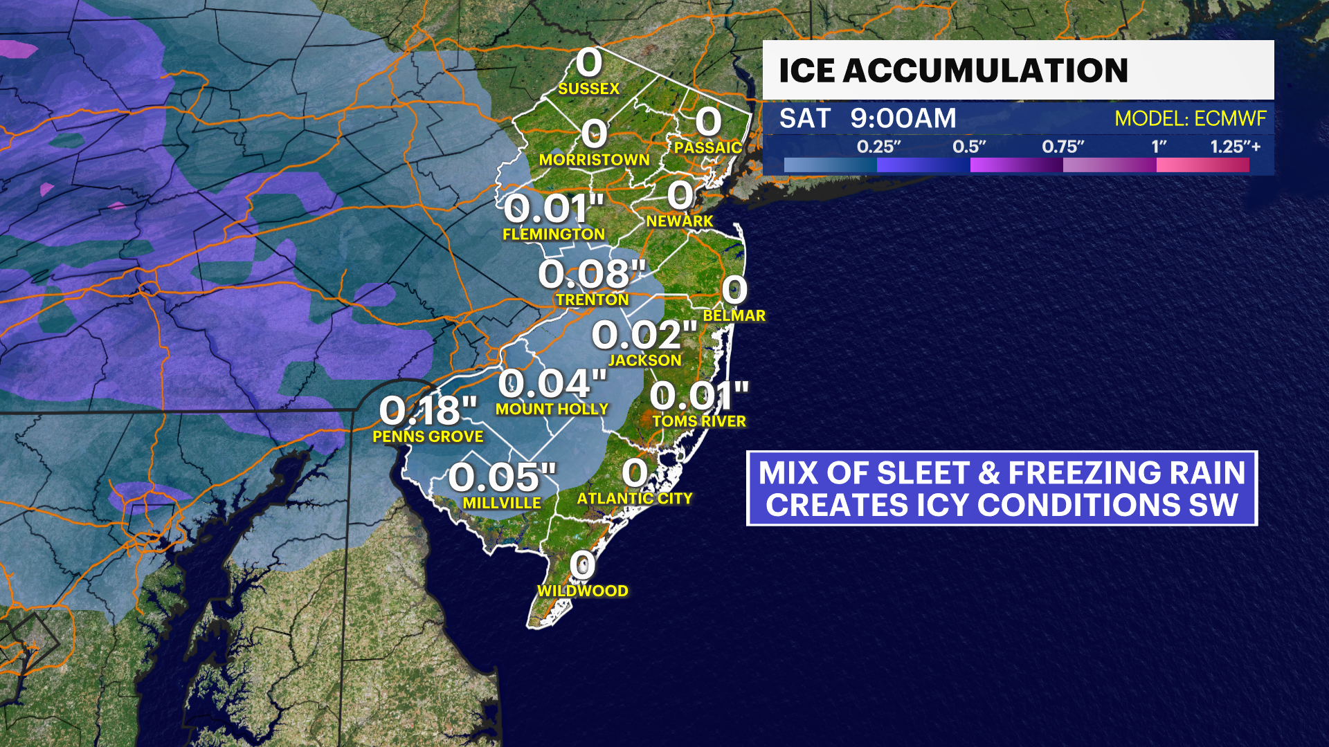 This icing can be significantly worse than snow as it creates dangerously slippery conditions quickly. A coating of ice can be incredibly disruptive and overall dangerous on Saturday morning, especially for southern counties, in the greater Philadelphia and Camden areas, through Delaware and northern Maryland. The snow wraps up as snow showers into Saturday morning, clearing for the afternoon to sunshine and breezy conditions. Saturday night will be cold and brisk.