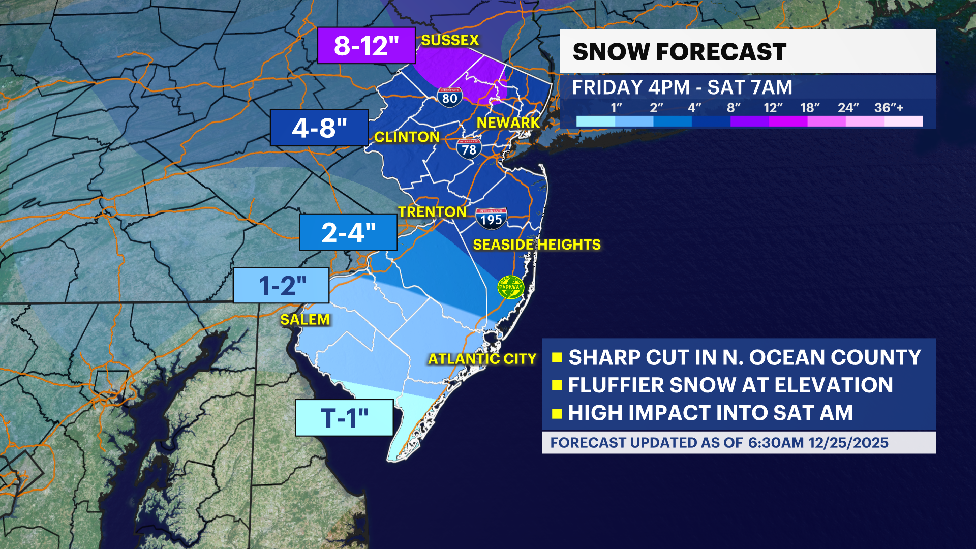 The forecast will vary depending on where you live and where you plan to travel from Friday night to Saturday morning. A general four to 8 inches of snow is expected, with higher amounts from 8-12 inches at the higher elevations in northern New Jersey. There will likely be a snow band that develops to drop the highest amounts of snow in the northern areas.