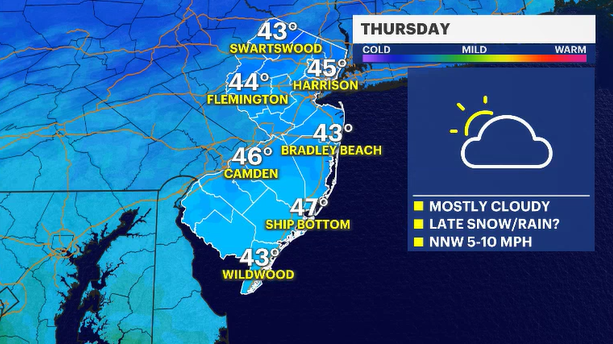 We will need to keep an eye on the radar tomorrow. There is a chance - a small one - a very small one, that snow could creep up from the south. Most of the meteorological evidence is hinting that this piece of energy stays south with rain, but if it does wobble back up north, we would likely see some spotty snow showers late in the day. Otherwise, it'll be mainly cloudy with hints of sunshine and afternoon highs in the low 40s