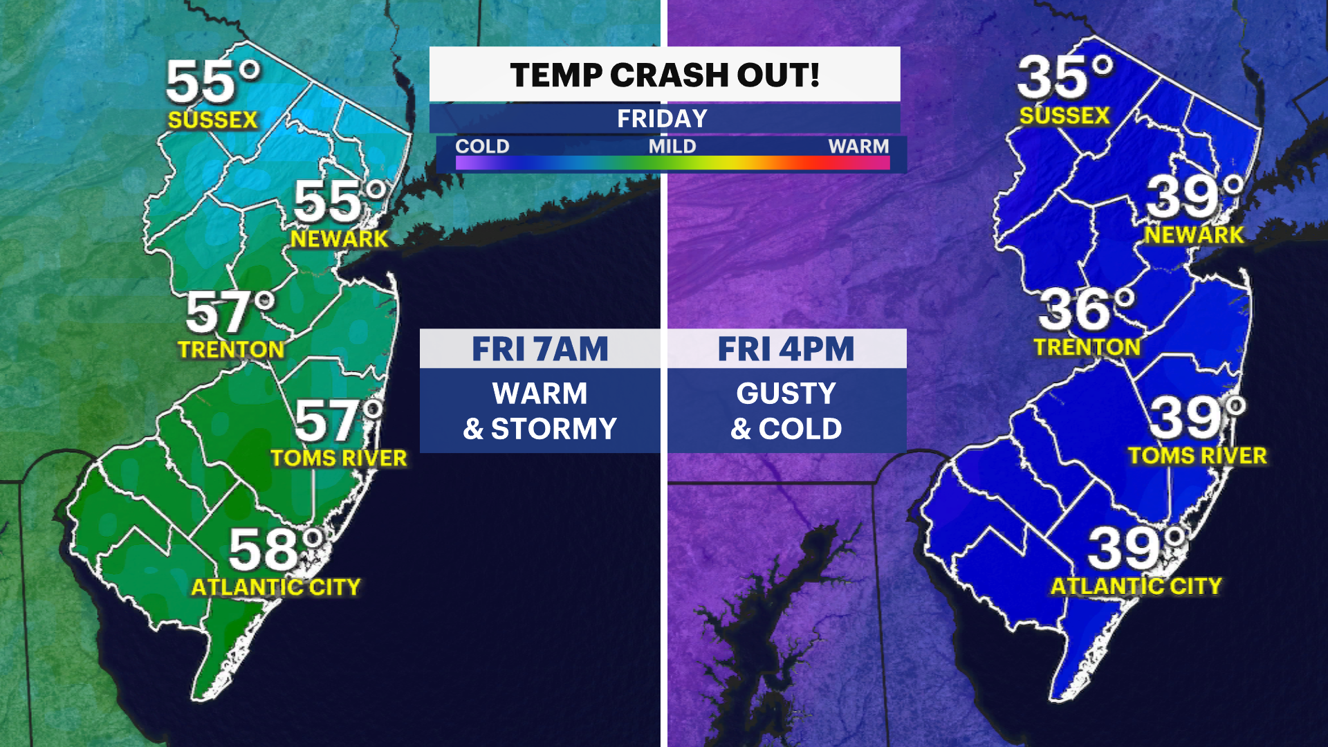 Temperatures crash from 60 to 40 in the mid-morning then gradually fall even more through the afternoon and evening as colder Canadian air forces away any sense of milder conditions. The wind calms into Saturday, but it is still brisk. The weekend is fair with sun and clouds and temperatures closer to normal.