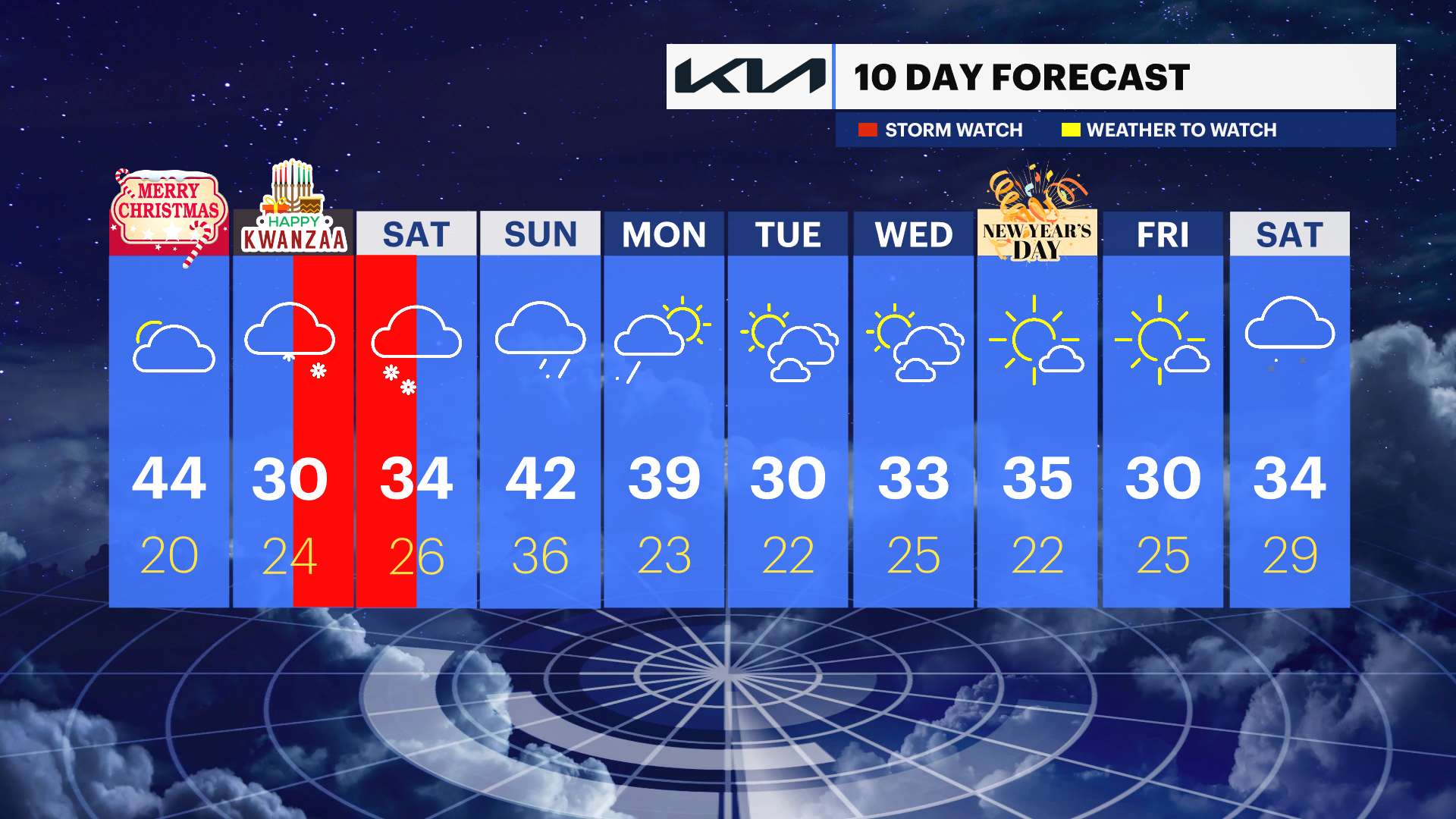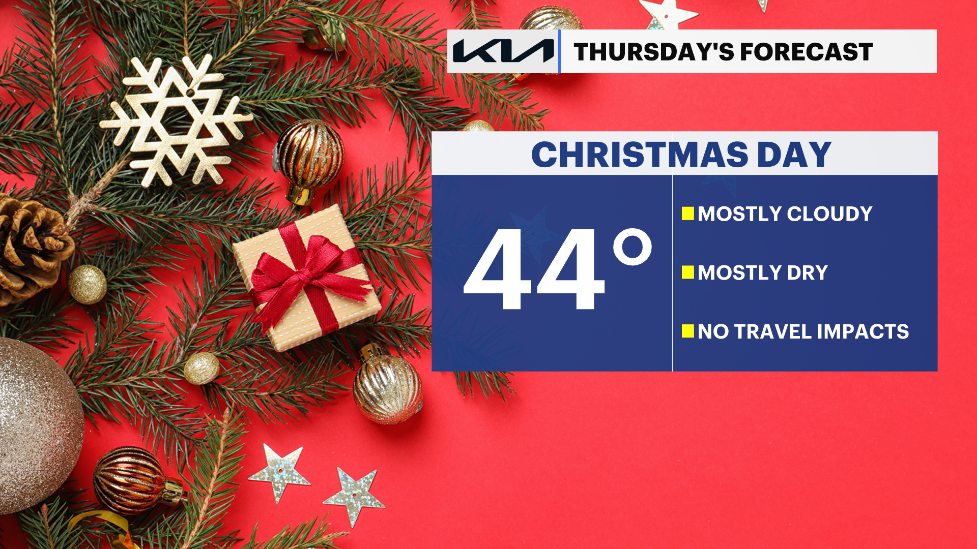 THURSDAY: CHRISTMAS DAY — Partly sunny to mostly cloudy. Slight chance for a spotty shower, but most of the day is dry. No major weather-related travel impacts expected. Highs near the low to mid-40s. Lows around 20 degrees.