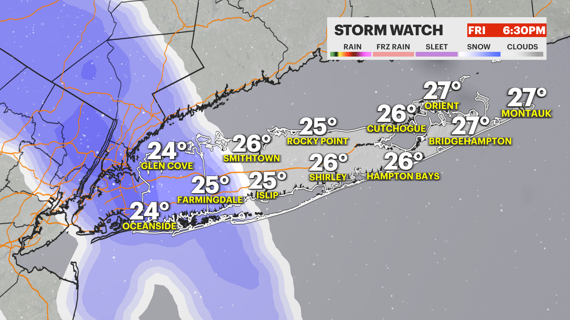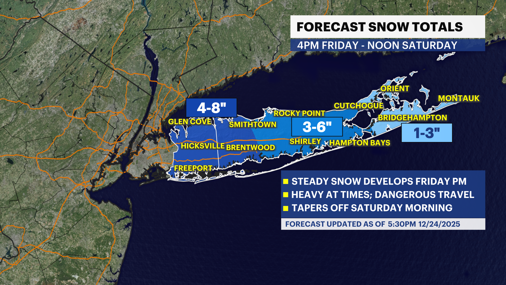 SNOW FORECAST: A general 3 to 6 inches of snow is expected for most of Long Island. Across the East End of Long Island, those totals can be more in the 1- to 3-inch range which is why a winter storm watch is not in effect as of Wednesday night. There will likely be a winter weather advisory issued for this area if forecast snow amounts do not increase. In Nassau County and western and central Suffolk County, isolated higher amounts between 6 and 8 inches cannot completely be ruled out at this time. Stay with News 12 for updates throughout the rest of this week.