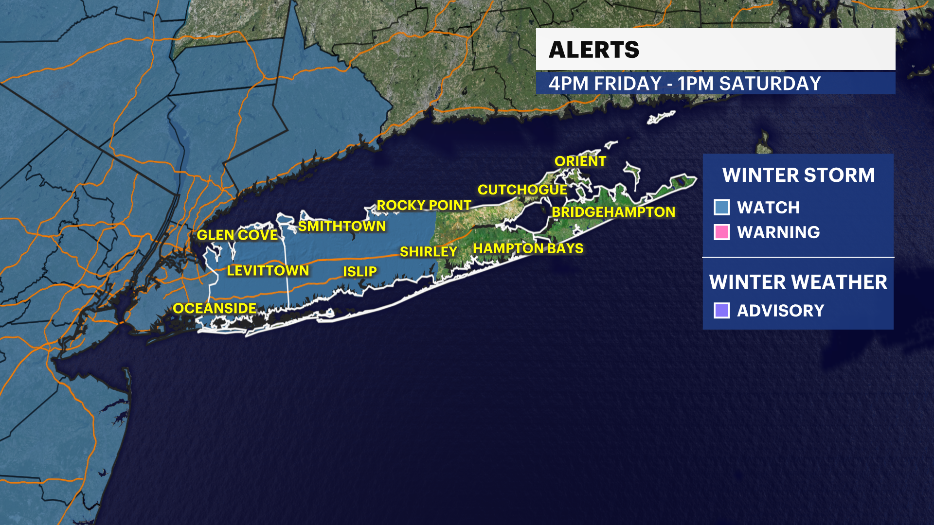 ALERTS: A winter storm Watch has been issued for Friday evening for much of Long Island. Heavy snow is likely with the potential for travel impacts. A watch means conditions are favorable in the near future. A warning means they are definitely happening and more imminently. This watch can be converted to a "warning" as we get closer to the snow starting.