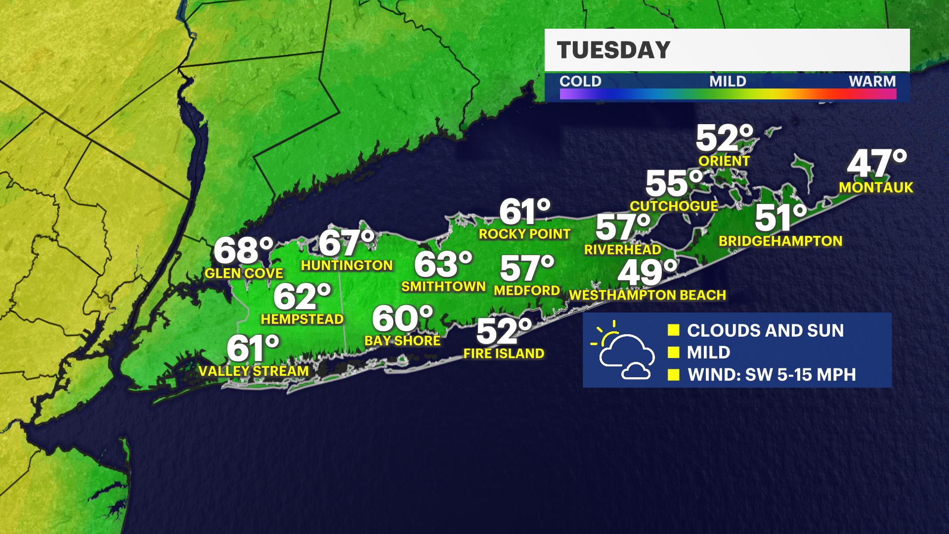 Some morning breaks of sunshine then mostly cloudy skies will dominate Long Island today, and it will stay relatively mild for mid-March. High temperatures will climb into the 60s across western Nassau County, while communities closer to the shoreline remain a bit cooler in the 50s thanks to the ocean influence. As the day goes on, expect a few scattered showers to develop late in the afternoon and toward the evening commute.