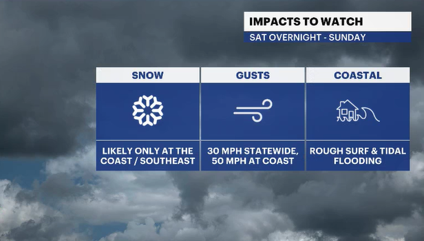 Potentially damaging winds would be the issue for much, if not the entire state. Gusts will frequently be 25 to 30 mph, but higher gusts of 40 to 50 mph, especially at the shore, could be common throughout Sunday.
