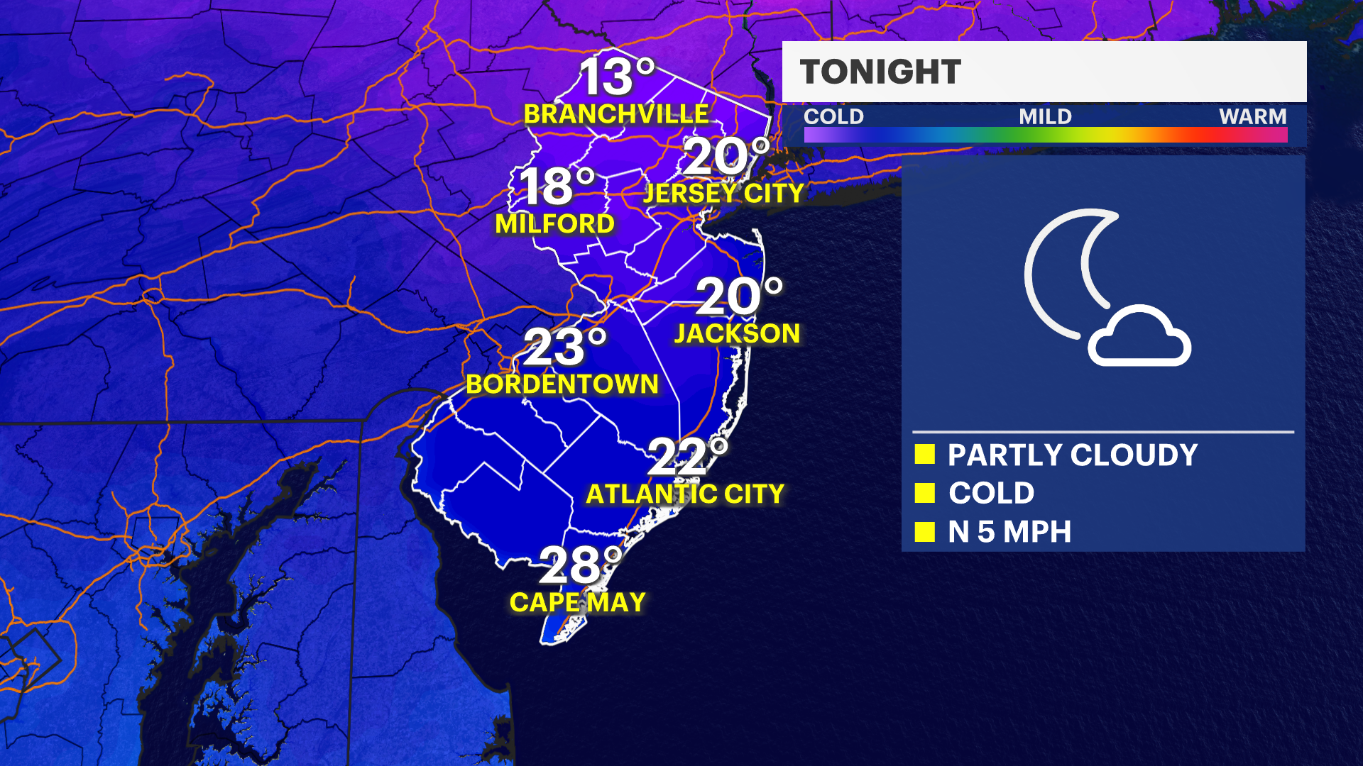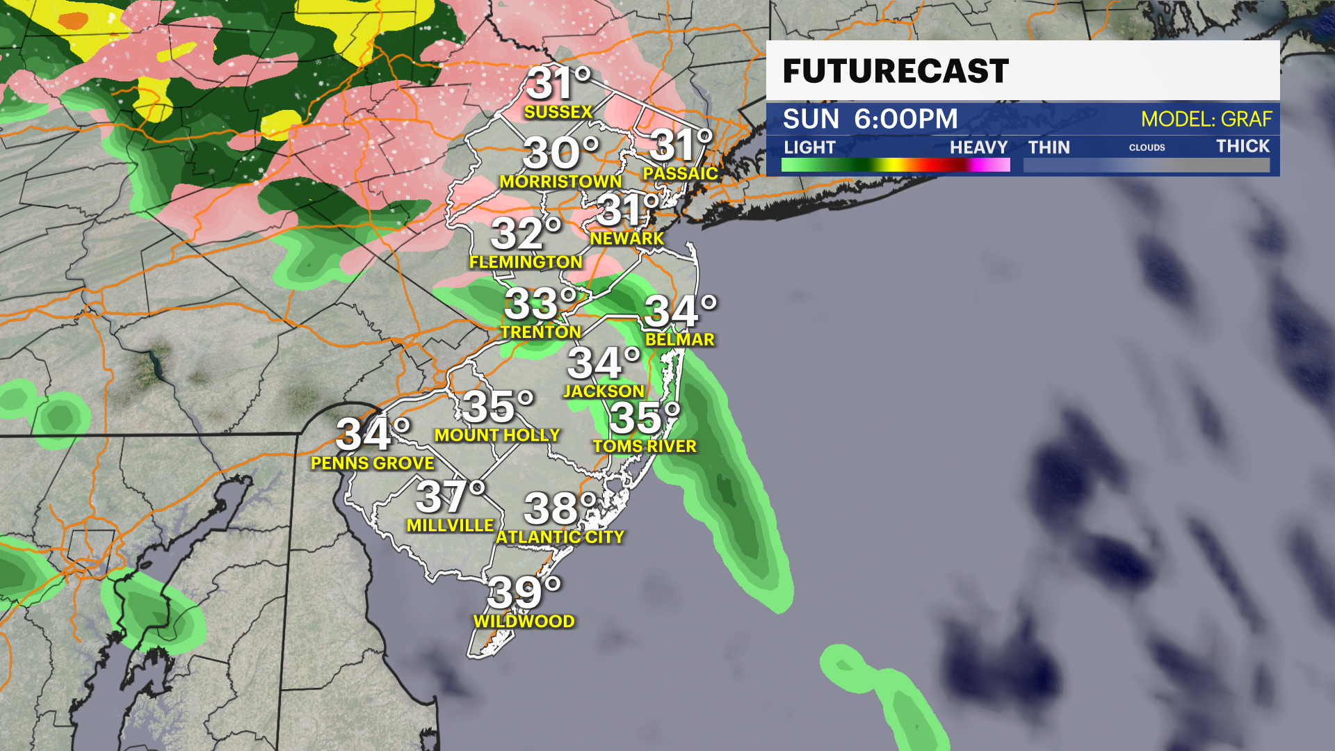 Sunday starts off very cold, but temperatures will climb above freezing through the day under mostly cloudy skies. Some rain will move though later Sunday and into Monday. There is a potential for some icing at the start for Northern Jersey. Otherwise, rain showers on Monday and turning mild.