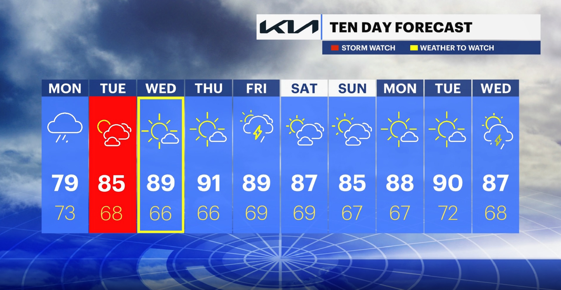 WEDNESDAY: Mostly cloudy skies, with some sunshine. Daytime highs around 83 degrees. Overnight lows around 67.