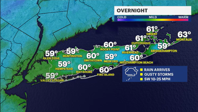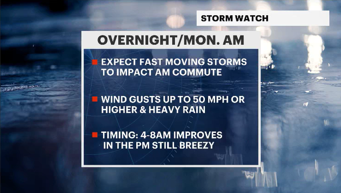 OVERNIGHT: Rain will arrive along with strong winds gusting between 30-40 MPH and could reach around 50 MPH. Heavy rain at times into the morning commute. Lows in the upper 50s.