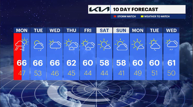 MONDAY: Expecting a slippery and windy morning commute. The storms will end quickly in the morning, leading to a cloudy, drier, and breezier day that is also much cooler. Highs in the low 60s.
