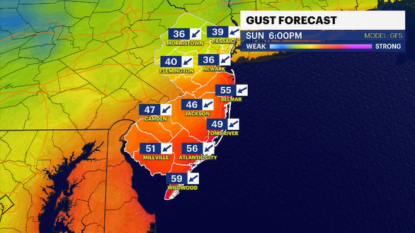 RAINFALL: Varies town to town. Again, I think the shore is likely going to see between 2 to 3 inches on top of the coastal flooding. Some roads may be impassable on Sunday. Elsewhere in the state, maybe up to an inch is possible. Rainfall is a good thing since we desperately need it.