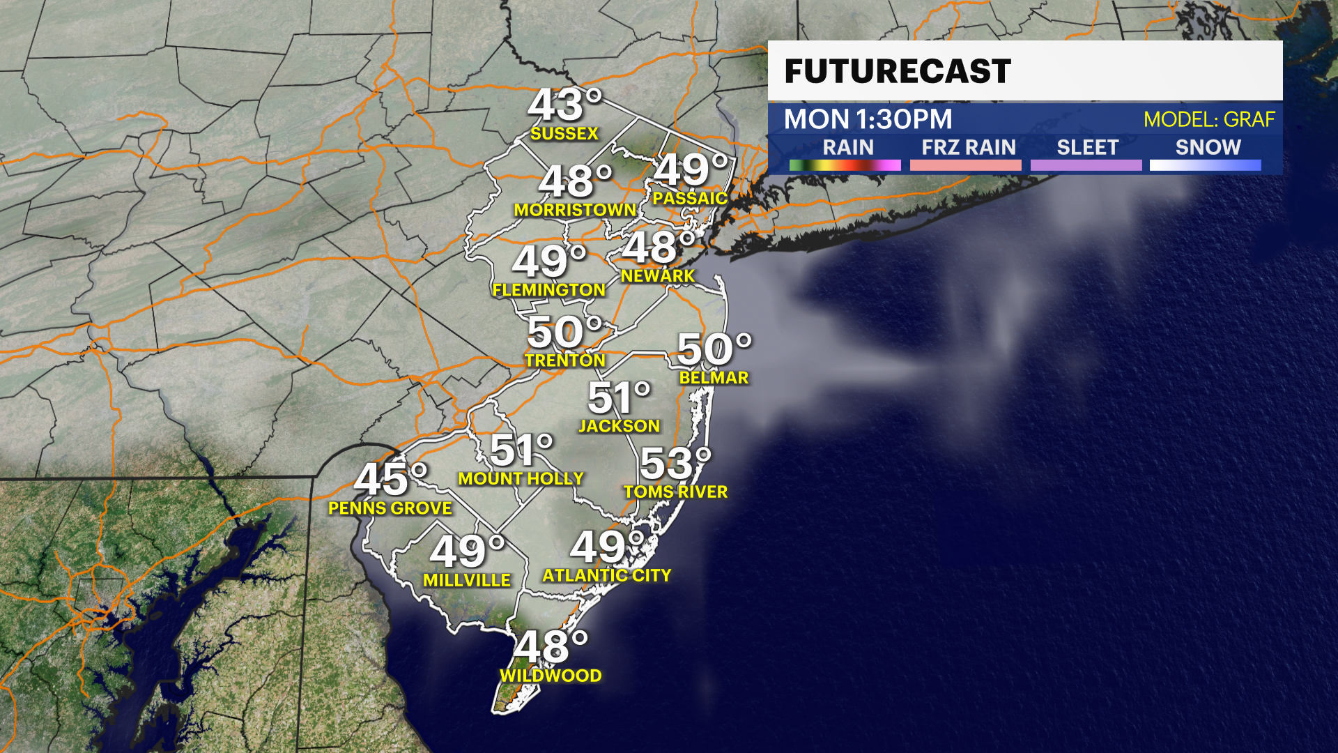 Clouds continue to build for the evening and into the overnight. It will be calm and quiet for the overnight, but cold. Temperatures will be dropping into the 20s and low-30s. Monday temperatures soar into the 50s and high temperatures stay in the 50s through Thursday. Then there will be a steady cool off into the weekend. Low temperatures continue to get less harsh. By Tuesday night, there will see more widespread lows above freezing temperatutes that will stay there for a few days. Temperatures will be well above average for the first half of the week. The end of the week will feature some cold air from Canada returning New Jersey to more seasonable temperatures.