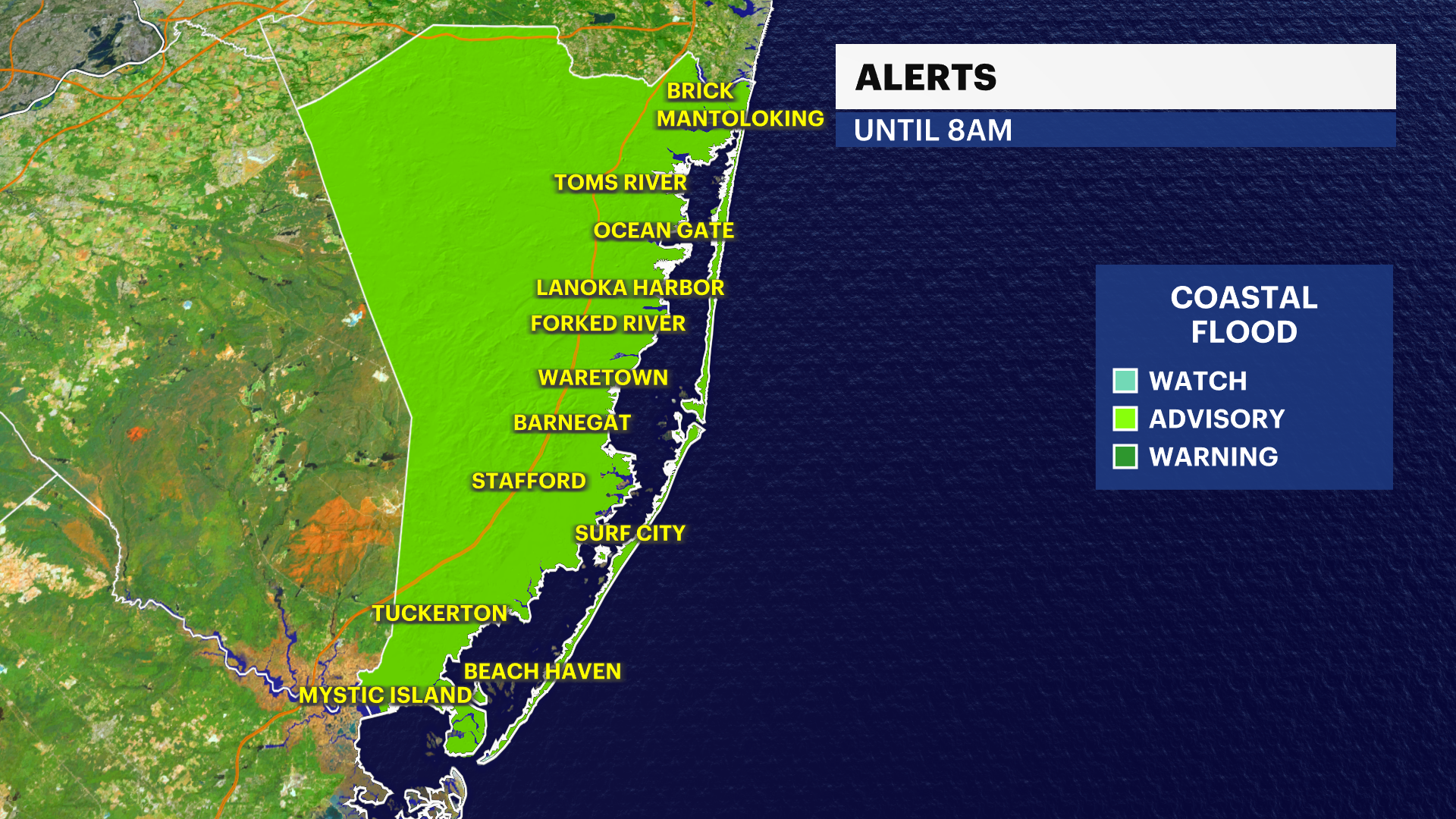 There is a COASTAL FLOOD ADVISORY in effect for Ocean County this morning as lingering minor flooding takes place during this high tide cycle. The future high tides today are not expected to be problematic.