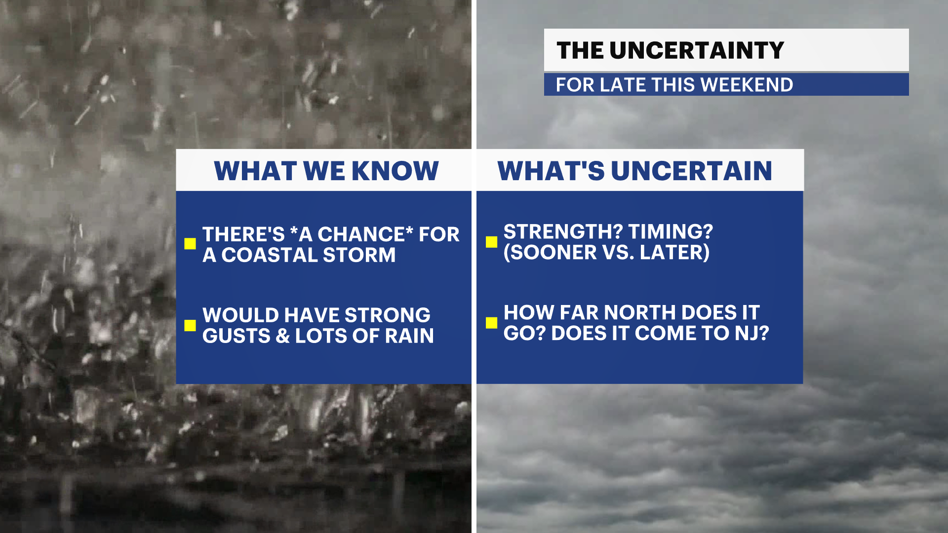 Sunday and Monday is subject to change as there is potential for a coastal storm to develop. This could bring rain and wind to New Jersey if it forms and moves northward enough. There is a chance that it can stay farther south due to the strength of the fall-like fair weather pattern over the northeast. However, there is a chance it can brush up along the Jersey Shore making for windy and rainy coastal impacts into Monday. This needs to be watched carefully.