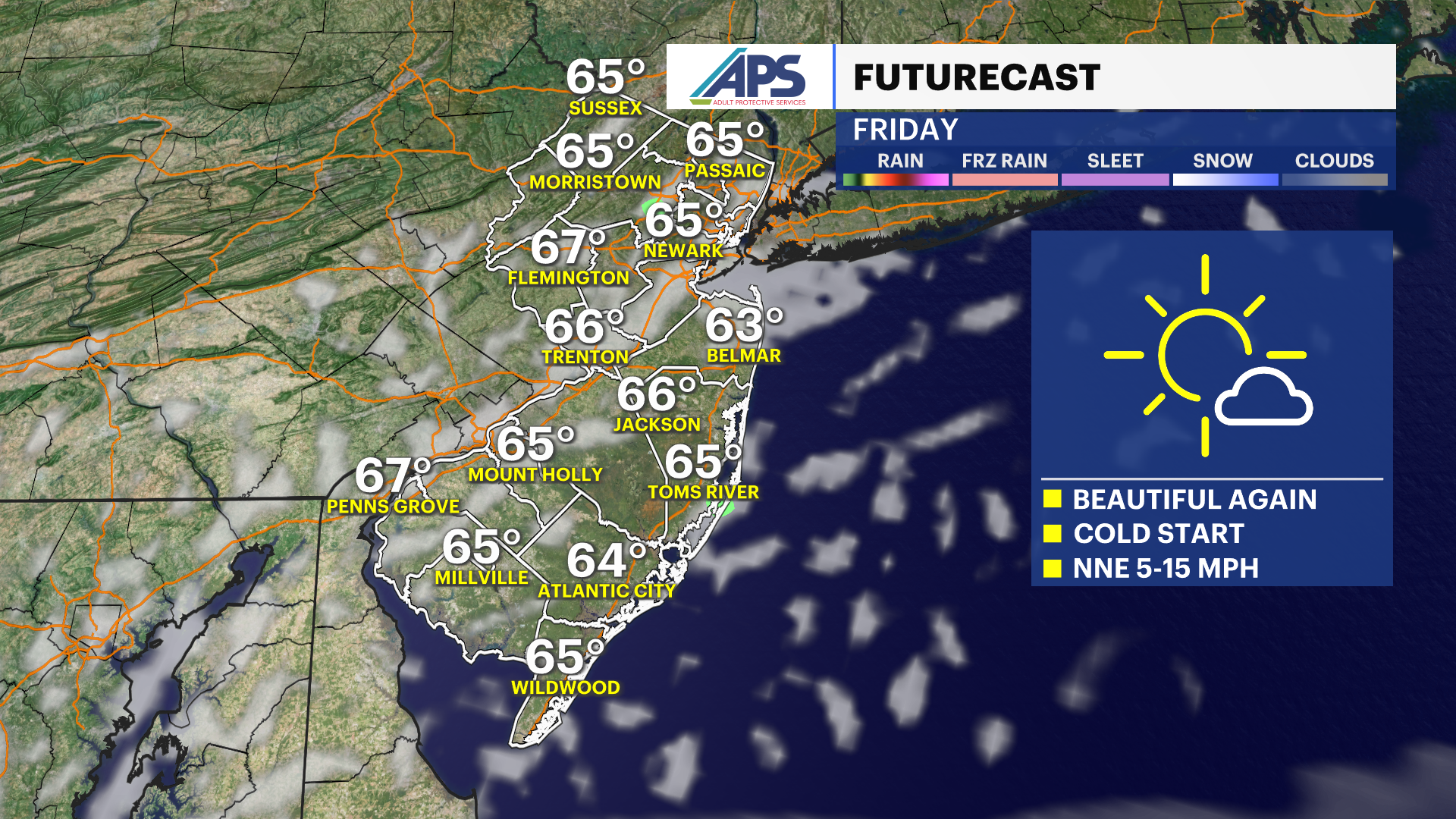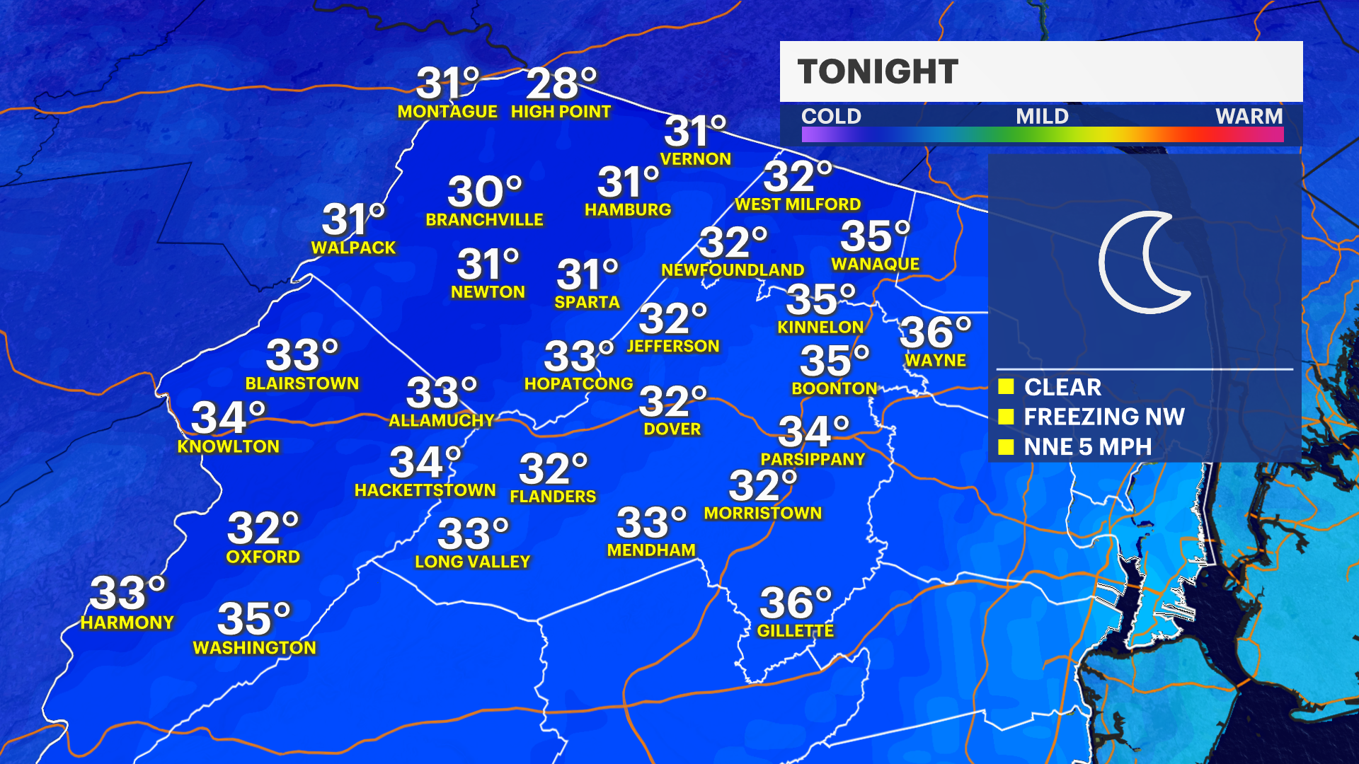 Really lovely weather lingers across New Jersey through the next few days as the autumn temperatures have finally arrived. Our first batch of bellowing freezing temperatures are on the way tonight in the northwestern areas of the state, where lows will drop below 32 at the highest elevations. There is a Freeze Warning and Frost Advisory in effect for these affected areas as the cold can damage sensitive vegetation. Temperatures will rebound by tomorrow afternoon back in the mid-60s.