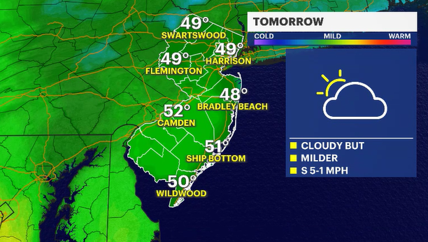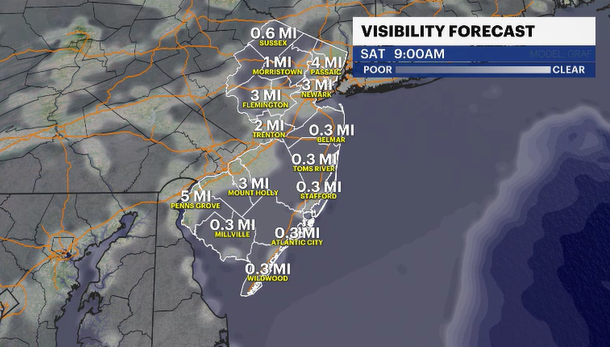 Speaking of the fog, be more cautious out on the New Jersey roads tonight. The visibility will be lower because of the foggy conditions. Those light winds and all this moisture at the surface will help the low clouds form and stick around.