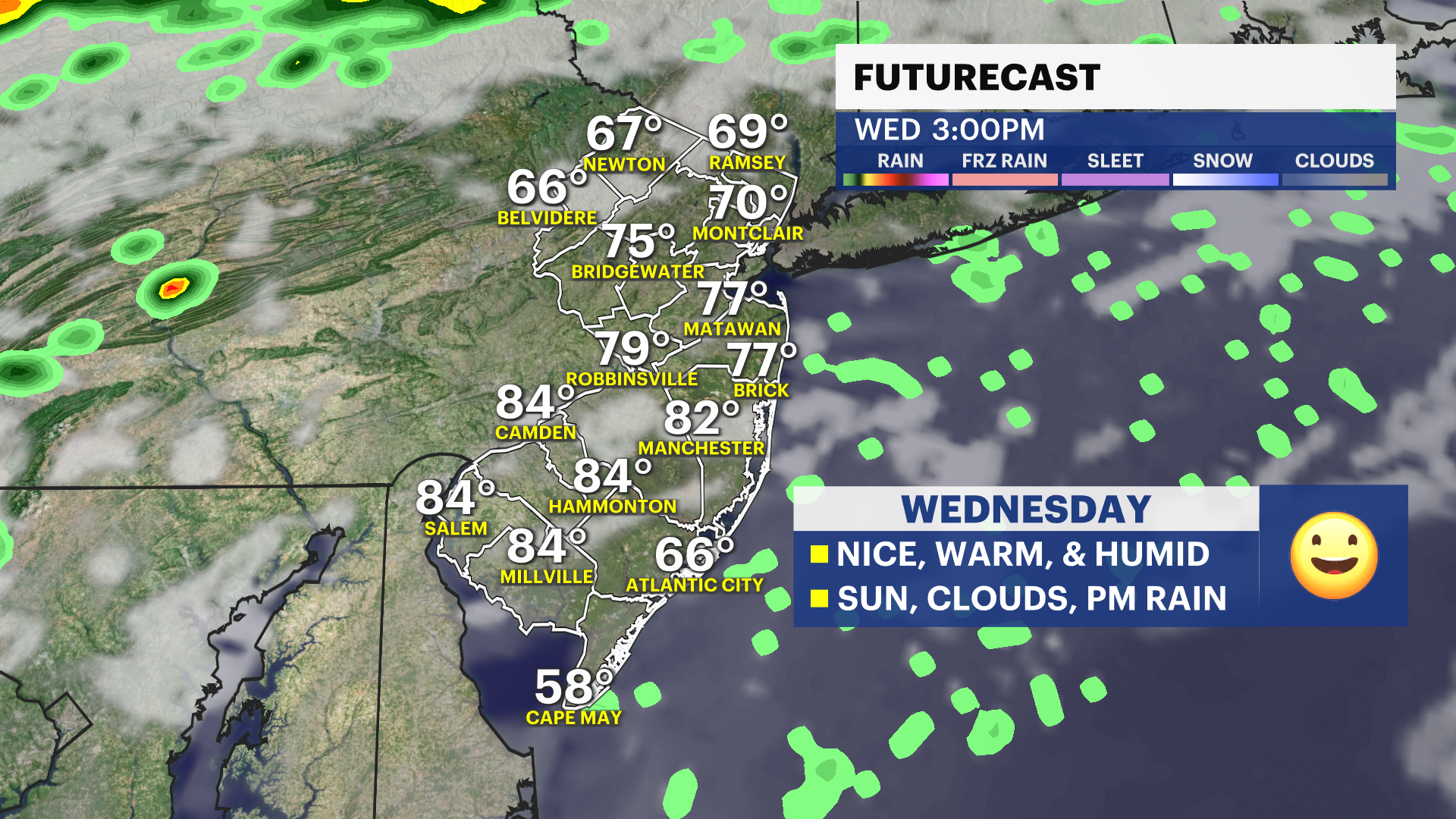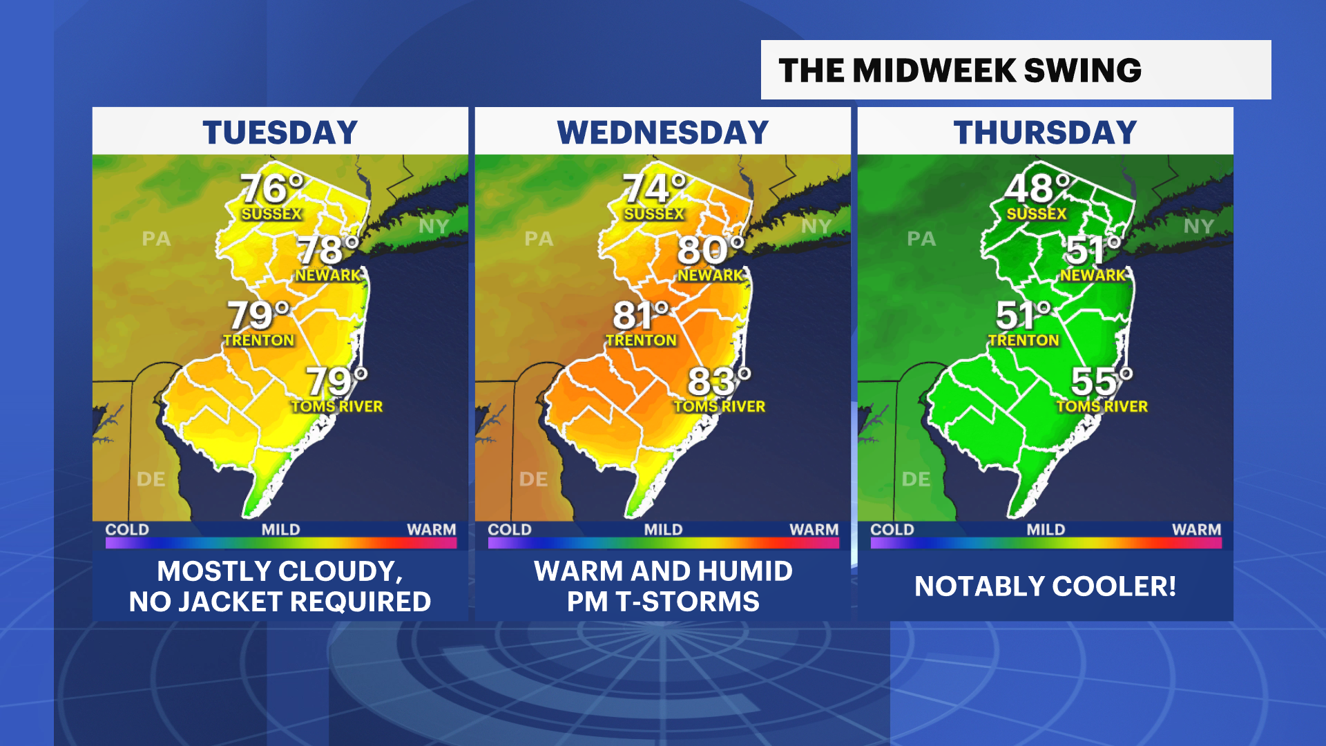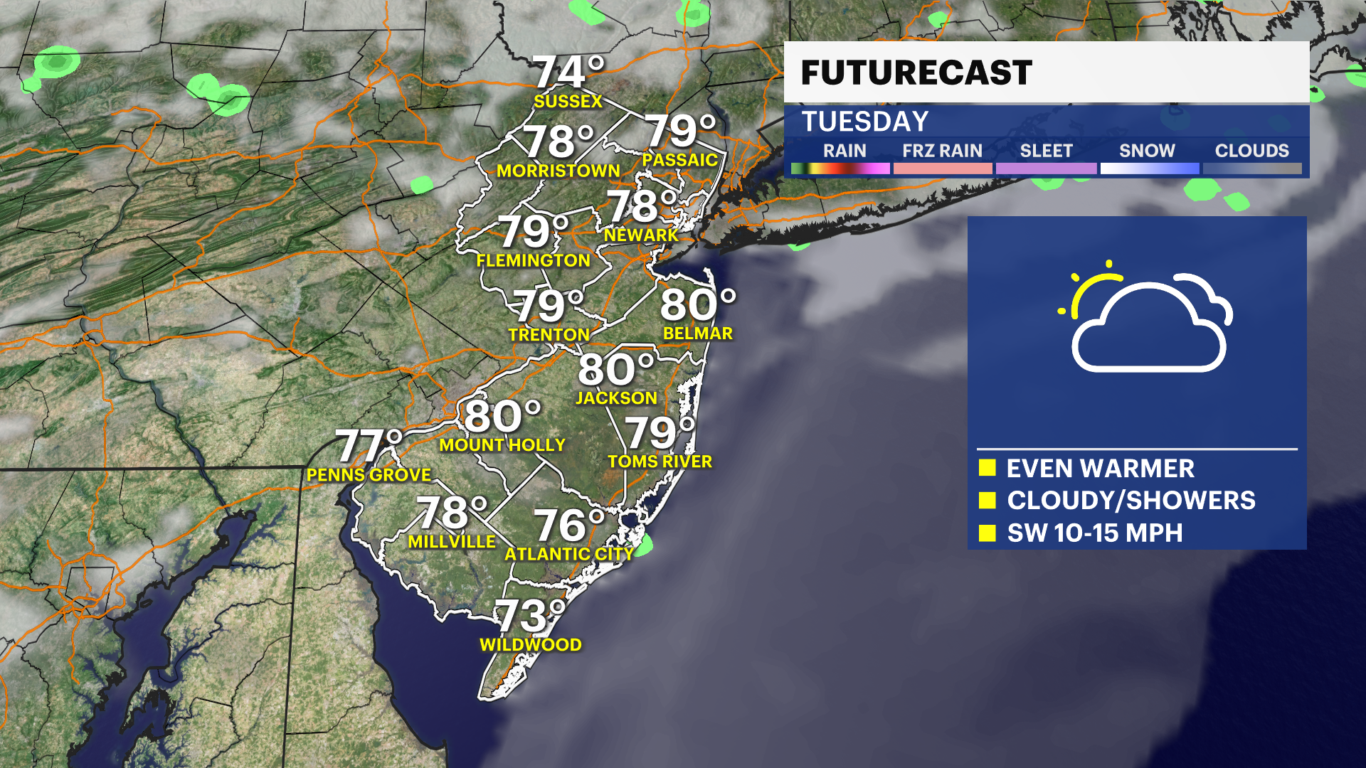 Periods of showers impact northern New Jersey counties through Tuesday morning, but then it should clear to a mostly sunny sky. Highs reach nearly 80 degrees and the humidity level rises. It should feel really nice into Wednesday as well with a similar circumstance with more humidity and warm temperatures near 80 degrees.