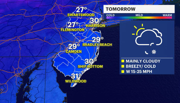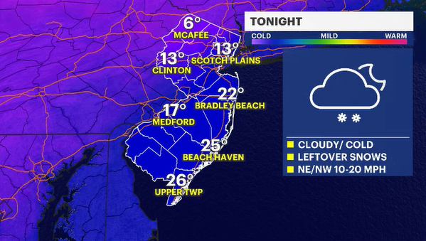 As the storm deepens and moves away from New Jersey after midnight temperatures will begin to drop. In northern New Jersey there isn't a drop. Actually, temps will warm a bit into the low 20s. At the coast and in southern zones the temperatures will crash and will lead to very icy conditions. Please be extra careful and allow extra time if you do have to head out in the morning.