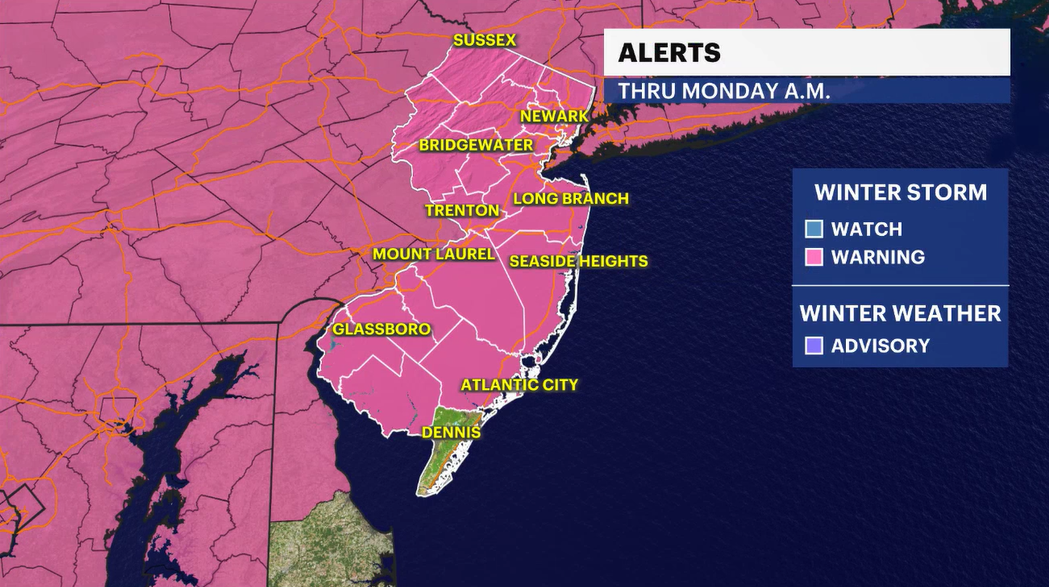 Winter storm warnings continue for 20 of the 21 counties in New Jersey through Monday morning.