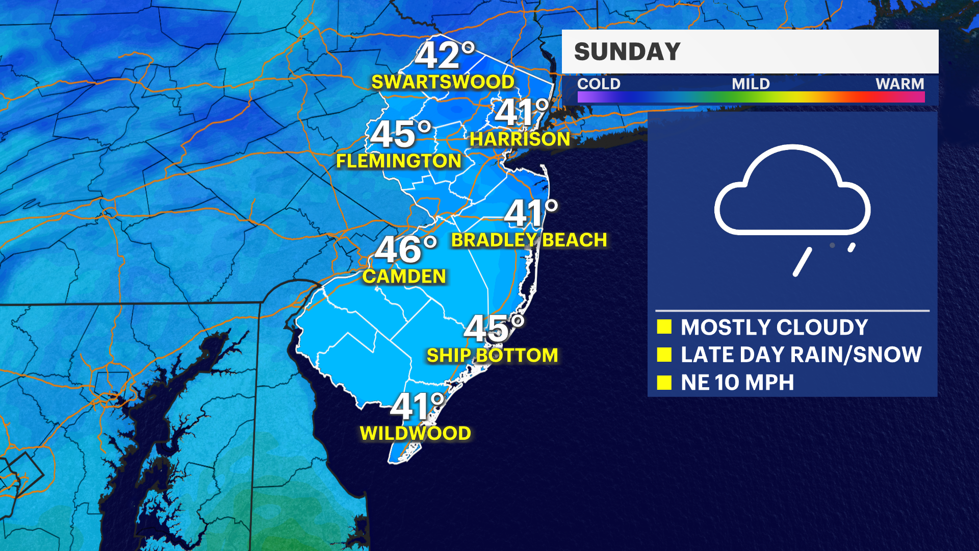The eventful part of the forecast is Sunday night with a round of light snow showers that pass overnight for most of the Garden State. The impacts are minor, and the precipitation will occur around sunrise on Monday. About 1 to 3 inches of wet snow is possible across the state. Some areas south like Monmouth, Ocean and Atlantic Counties will see a rain-wintry mix at first before a complete change over to snow. This will lower snowfall totals after the storm is over.