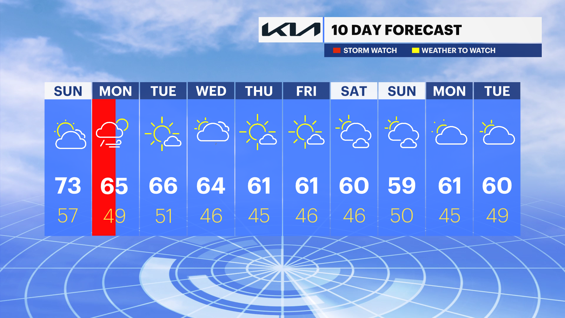 FORECAST: A mild and breezy day ahead with plenty of sunshine and highs near the low to mid 70s. Winds will pick up through the afternoon, gusting as high as 30 mph. Clouds move in tonight as a cold front moves in from the west, bringing showers and a few thunderstorms, mainly after 2 a.m. It’ll stay windy and mild overnight with lows near the mid to upper 50s.