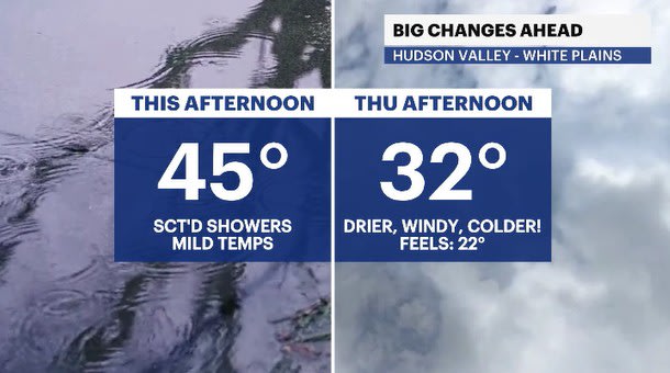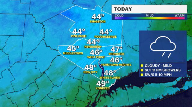 Enjoy the last "mild" day today while you can, Hudson Valley! Temperatures will turn chilly after today and sadly stay that way through the weekend and into much of next week. A cold front will slowly approach the region today, helping to kick off shower activity. Rain showers are expected, as temps will be into the 40s all across the area. Showers arrive this afternoon, from west to east, as the cold front moves our way.