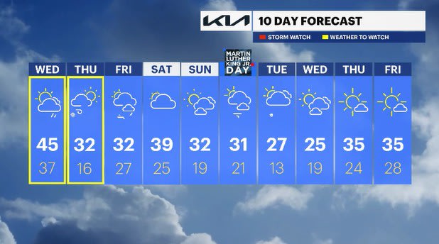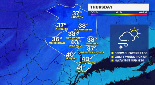 THURSDAY: WEATHER TO WATCH - Mostly sunny to mostly cloudy. Highs: low 40s. Lows: mid to upper 30s.