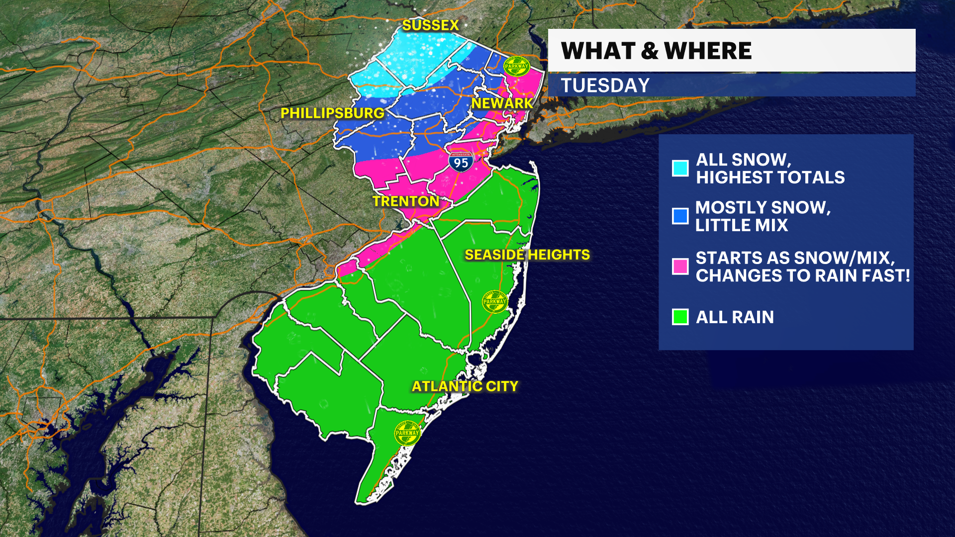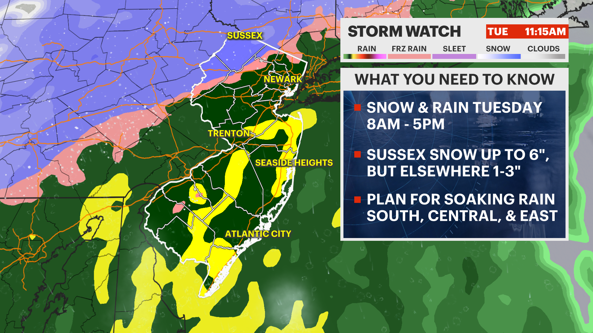 he rest of New Jersey may experience wet snow mixed with rain at first before changing over to plain rain. The plain rain will be the primary impact for the urban corridor of the state.