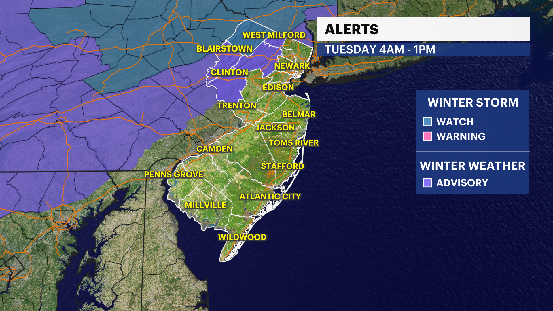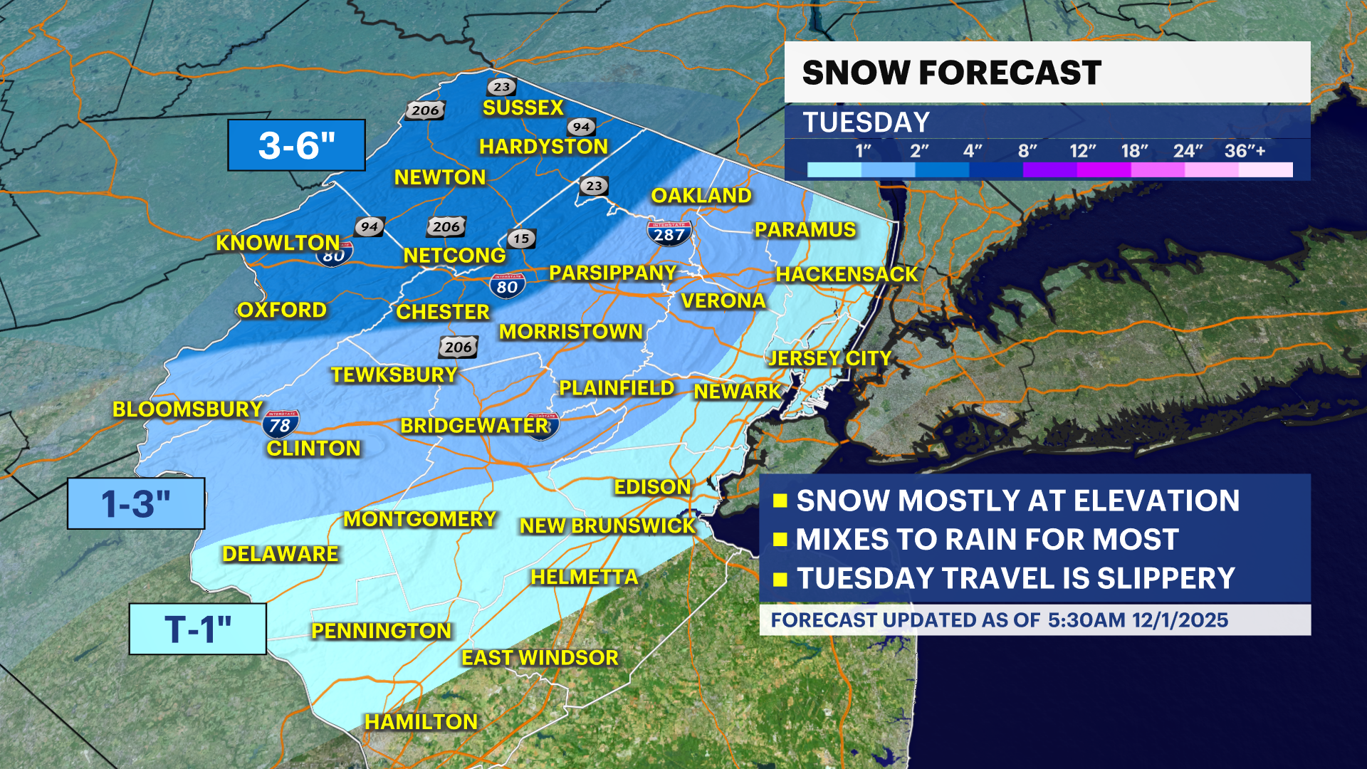 New Jersey faces a good helping of wintry weather on Tuesday with up to 6" of snow at the highest of the elevations, generally above 1000 ft.