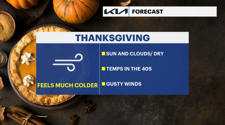Thanksgiving will be breezy and cold. Winds will make it feel colder. The winds will carry over to Friday morning. Early morning shoppers need to bundle up. Wind chills will be in the upper 20s and low 30s. Friday is mainly sunny and the wind continues. The wind looks to continue through Saturday.