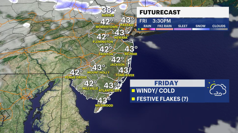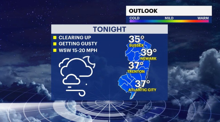 This will be part of the back end of a weather system that brought rain to the area yesterday and this morning. It was also responsible for the warm-up today. New Jersey climbed to 61 degrees, the warmest it's been since Nov. 10. This warm-up is short-lived. The winds will be changing direction, and much colder air from Canada is on the way.