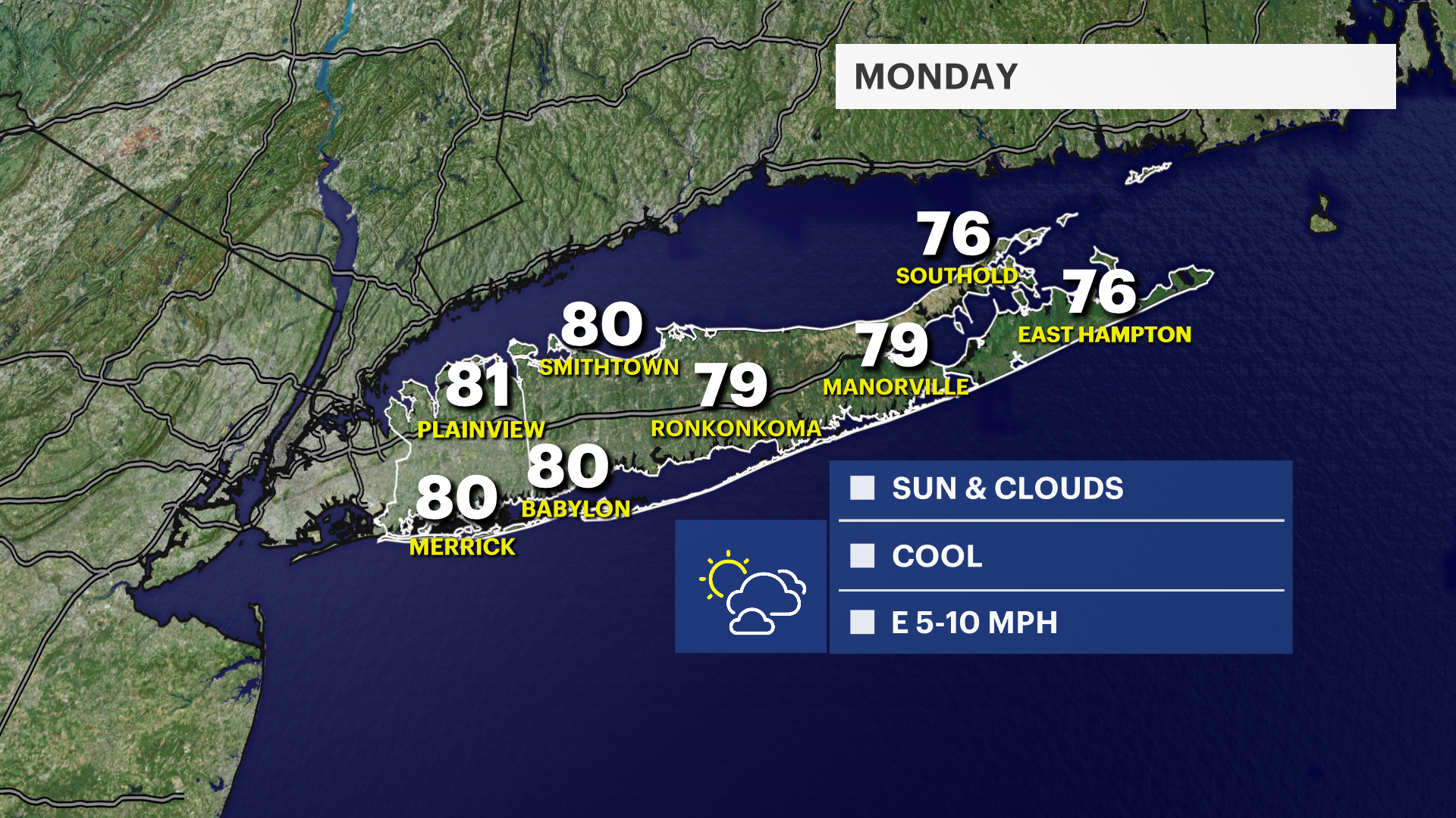 MONDAY: Sun and clouds. Highs near 80. A few showers possible in