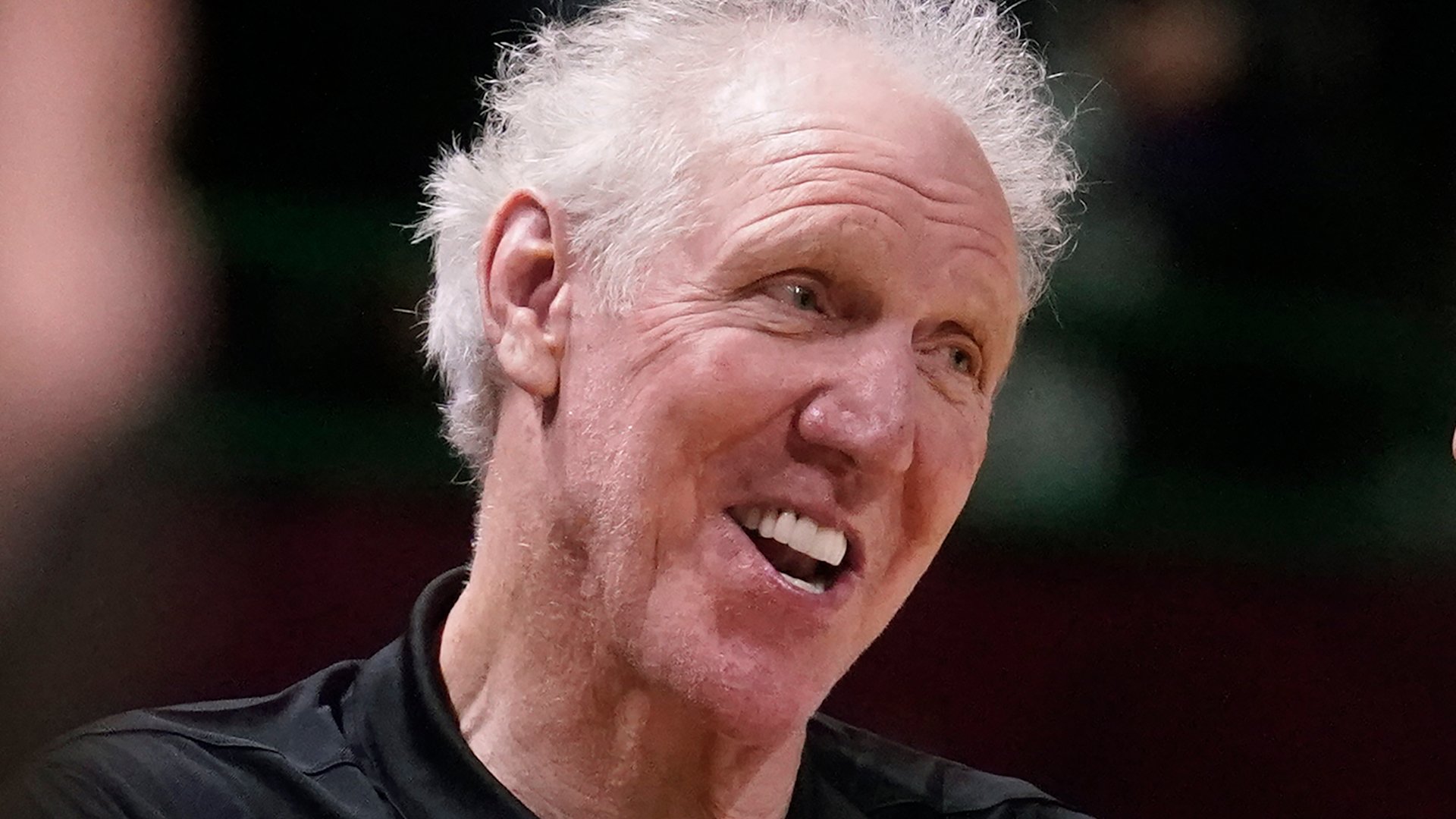 FILE - Basketball Hall of Fame legend Bill Walton laughs during a practice session for the NBA All-Star basketball game in Cleveland, Feb. 19, 2022. Walton, who starred for John Wooden's UCLA Bruins before becoming a Basketball Hall of Famer and one of the biggest stars of basketball broadcasting, died Monday, May 27, 2024, the league announced on behalf of his family. He was 71. (AP Photo/Charles Krupa, File)