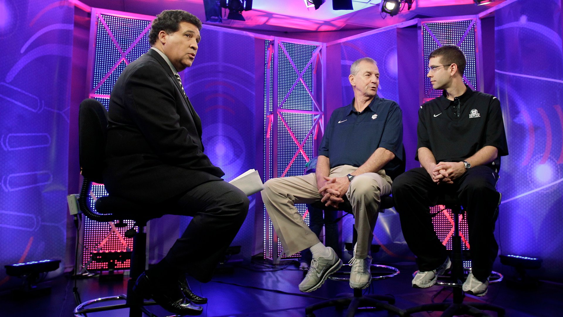Greg Gumbel, left, watches as Connecticut head coach Jim Calhoun talks to Butler head coach Brad Stevens, right, prior to taping a television interview for the men's NCAA Final Four college basketball championship game Sunday, April 3, 2011, in Houston. (AP Photo/Eric Gay)