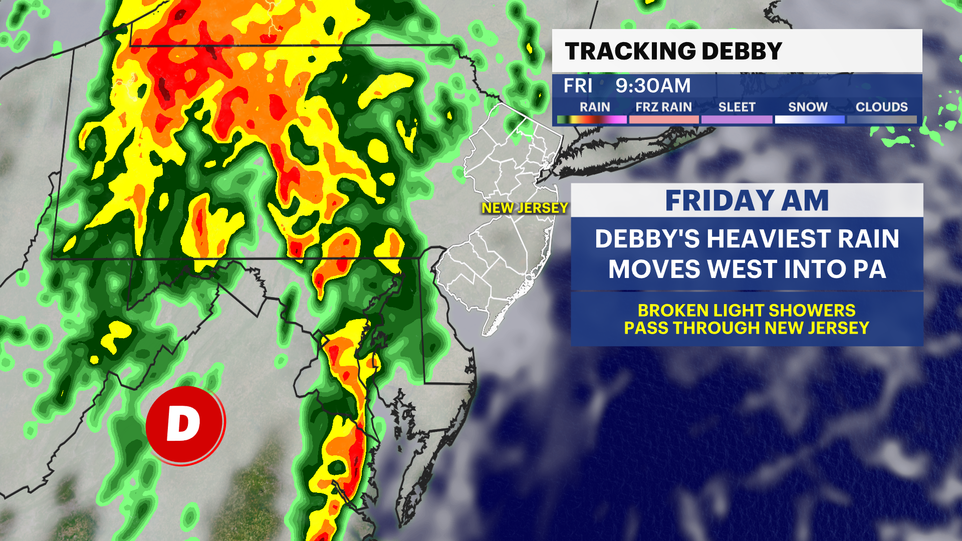 WHEN: Scattered rain showers persist today and tomorrow ahead of Debby's rain as the weather front responsible for steering Debby west of New Jersey continues to sweat out showers locally. Debby's downpours and thunderstorms are expected after 3 p.m. on Friday with rapid improvement from west to east on Saturday early morning as a front clears the moisture. Saturday will be breezy all day with lower humidity, sunshine, and warm temperatures.